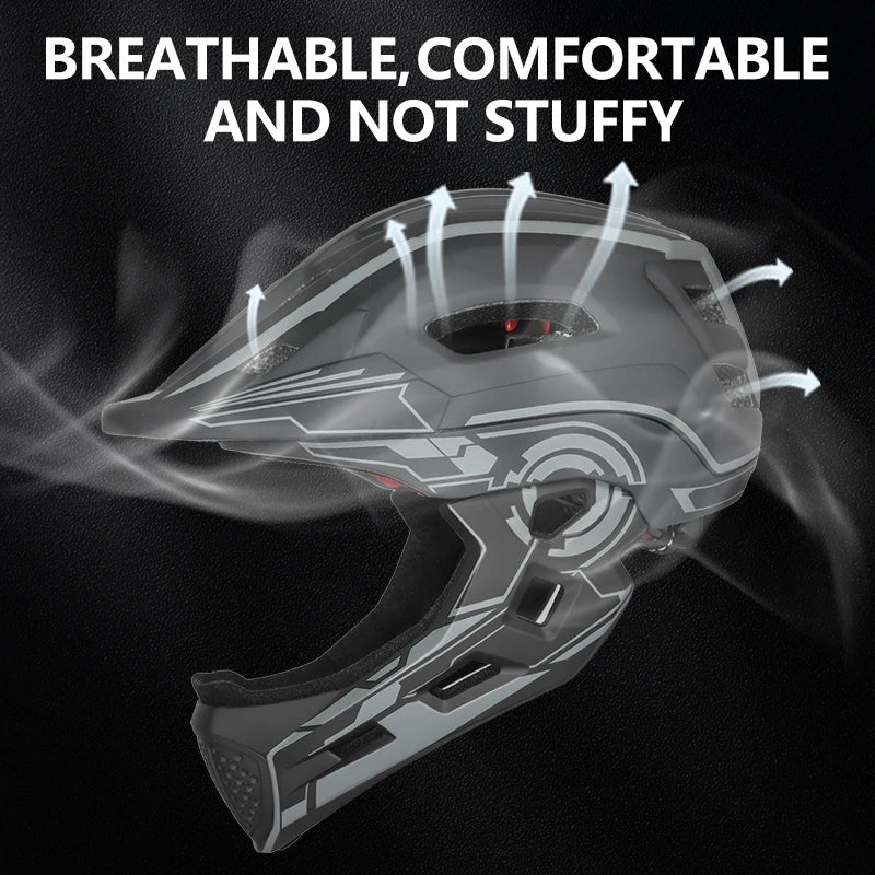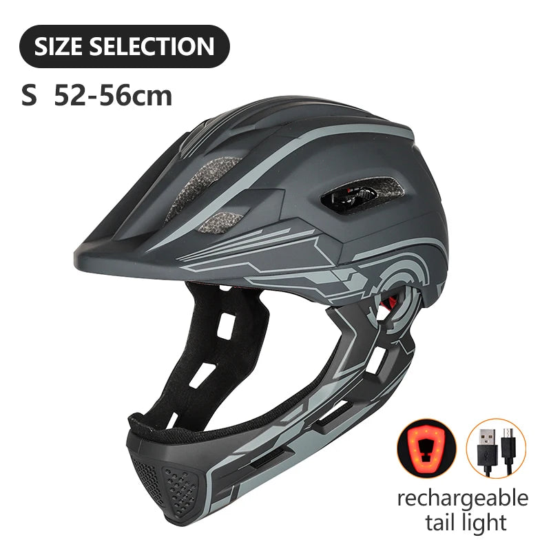 Give your child the ultimate protection during their outdoor activities with this high-quality, full-face kids' helmet, featuring a detachable face shield and a built-in rechargeable tail light. Whether it’s biking, skateboarding, scootering, or rollerblading, this helmet has them covered – literally.