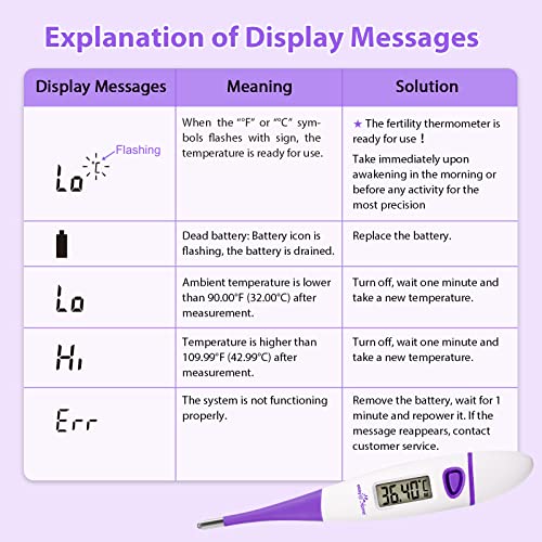 How to Use Digital Ovulation Thermometer: Please place the BBT thermometer under your tongue. For the most accurate result, take it right before you wake up in the morning or before doing any activities. When "℉" or "℃" starts flashing with "Lo" on display, the fertility thermometer is then ready to use. The digital BBT only takes around 1 min to read the results. NOTE: "Lo" does not mean the battery low