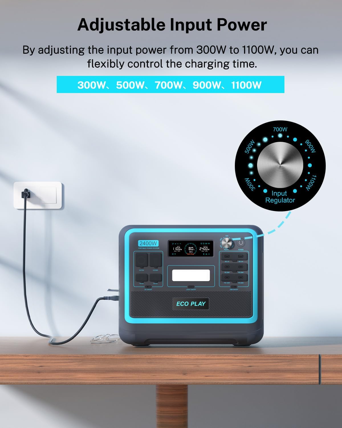 - 【 INTELLIGENT INPUT POWER SETTING】Ecoplay portable power station has adjustment input power knob, include 300W, 500W, 700W, 900W and 1100W input power. You can adjust the charging time of the AC charger effectively and flexibly control the time. It can be adjusted not only by adjusting the device according to the input power but also by preventing the device from being damaged by voltage instability.
