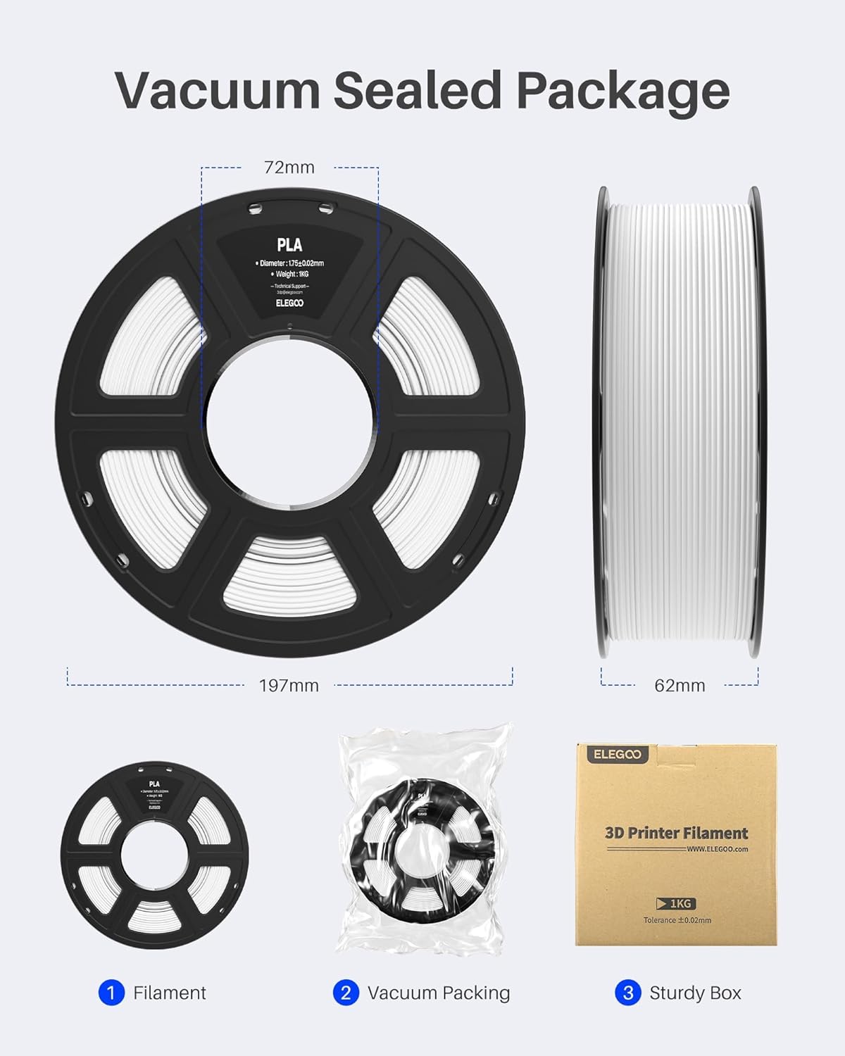 NO CLOGGING & NO BUBBLE: ELEGOO PLA Filament is complete dried before packaging and vacuum sealed well to protect the filament from moisture, no clogging and bubbling problems