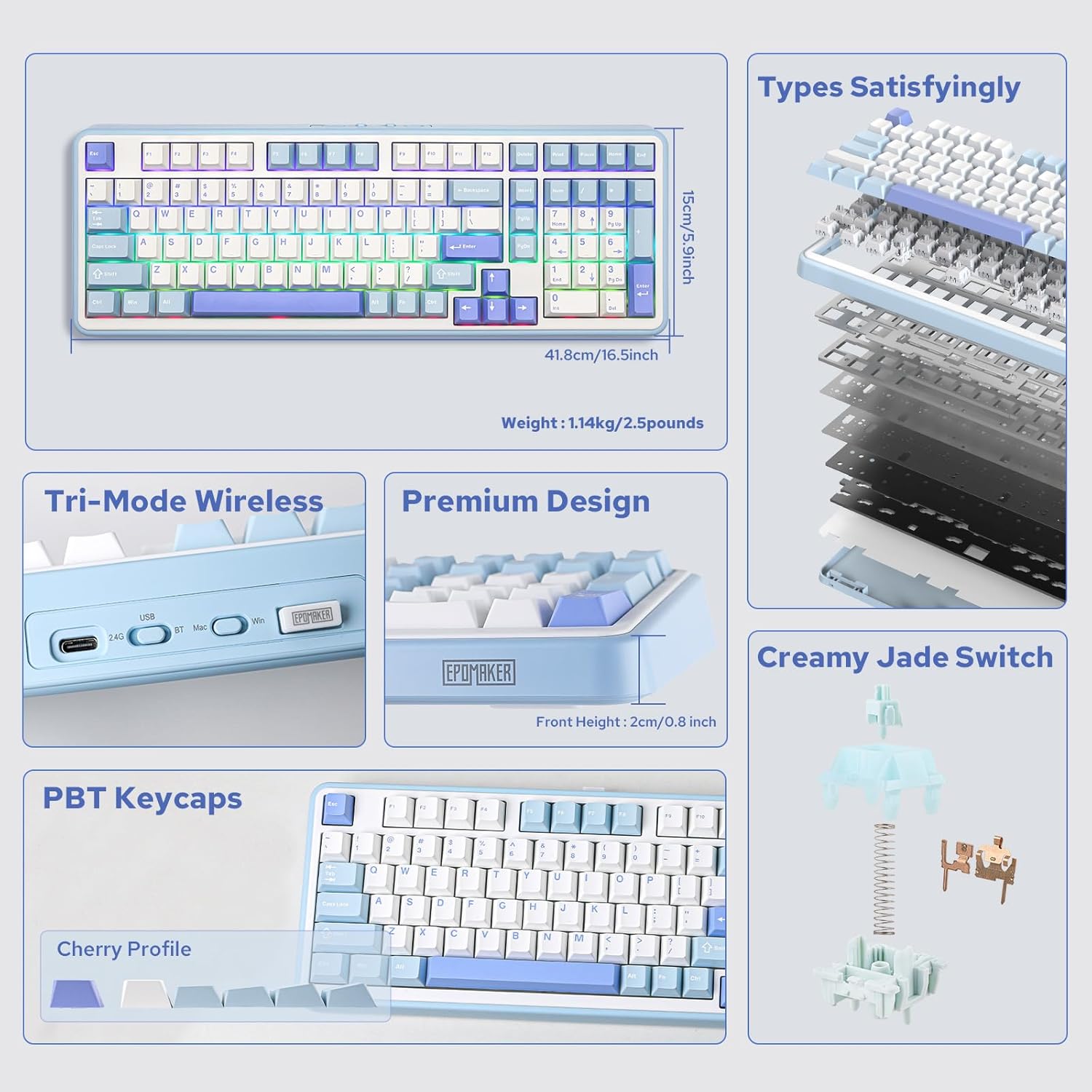 EPOMAKER TH99 Tri-Mode Wireless Mechanical Keyboard with 8000mAh Battery, Hot Swappable Custom RGB Gaming Keyboard with Numpad, Gasket Creamy for PC/Mac/Office (Blue&White)