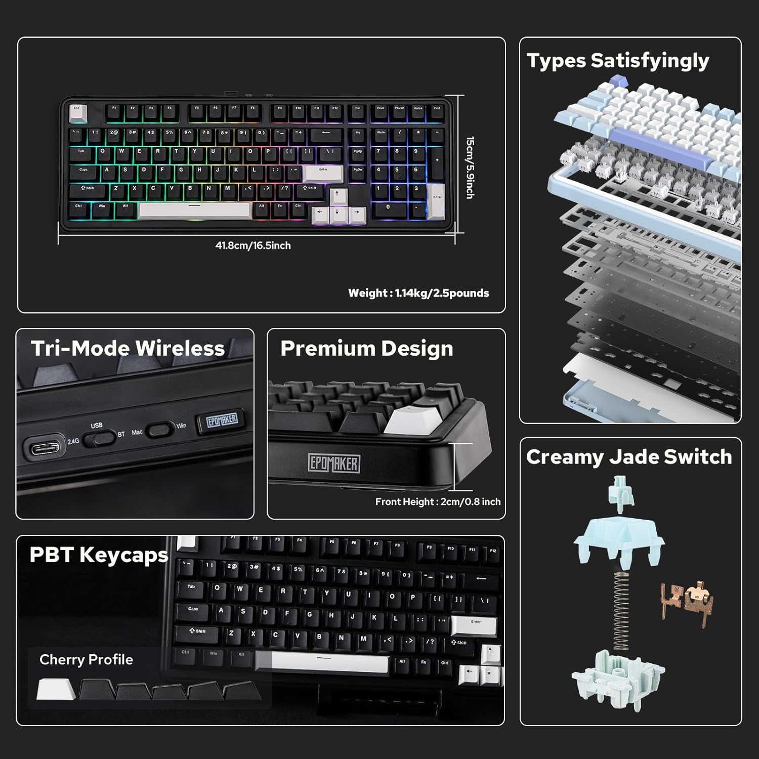 - Tri-Mode Wireless with Cross-System Functionality. Powered by a first-rate 8000mah battery that lasts 800 hours with Backlight off, the TH99 Wireless keyboard works in premium condition across computer, tablet, phone and gaming controller with a mere 2-5ms latency in cable and 2.4G mode. Enjoy the wire-free convenience of Bluetooth 5.0 and 2.4Ghz connection and experience the intuitive toggle control that switch between Mac and WIN mode with a simply push. Revel in the superior performance of the diverse EPOMAKER TH99 keyboard as the one-in-all solution for gaming, work and daily data input.