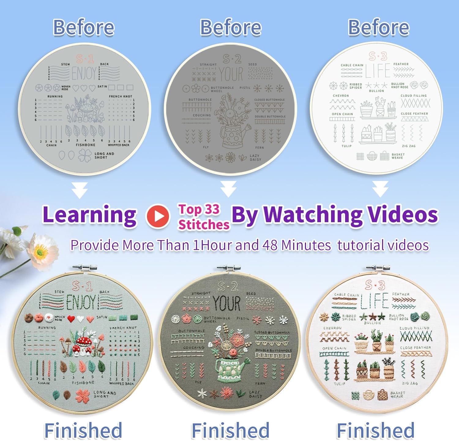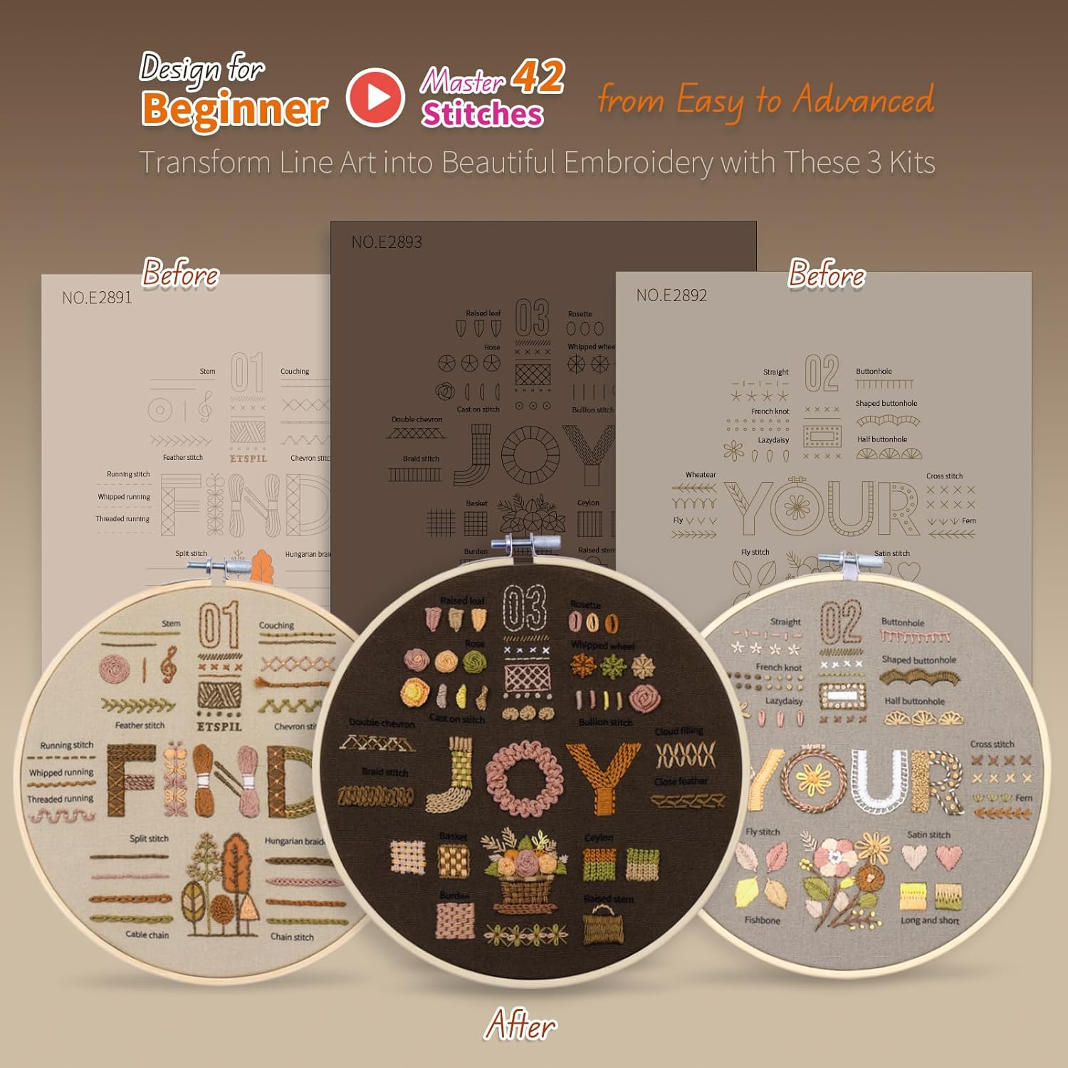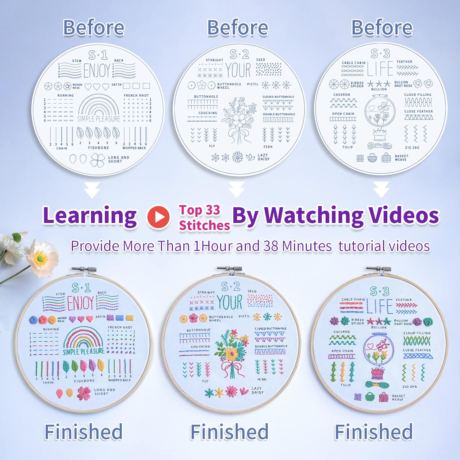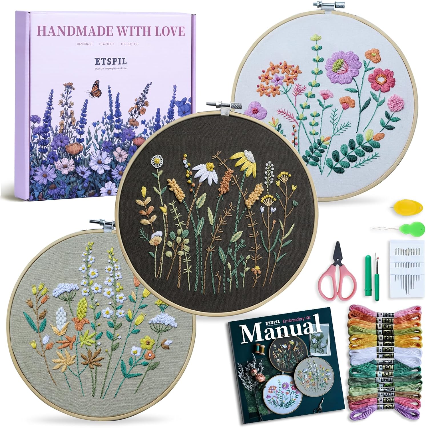Purilite Select 3 Pack Beginner Embroidery Kits for Adults – Floral DIY Starter Set with Hoop, Threads & Tools (Fun E)