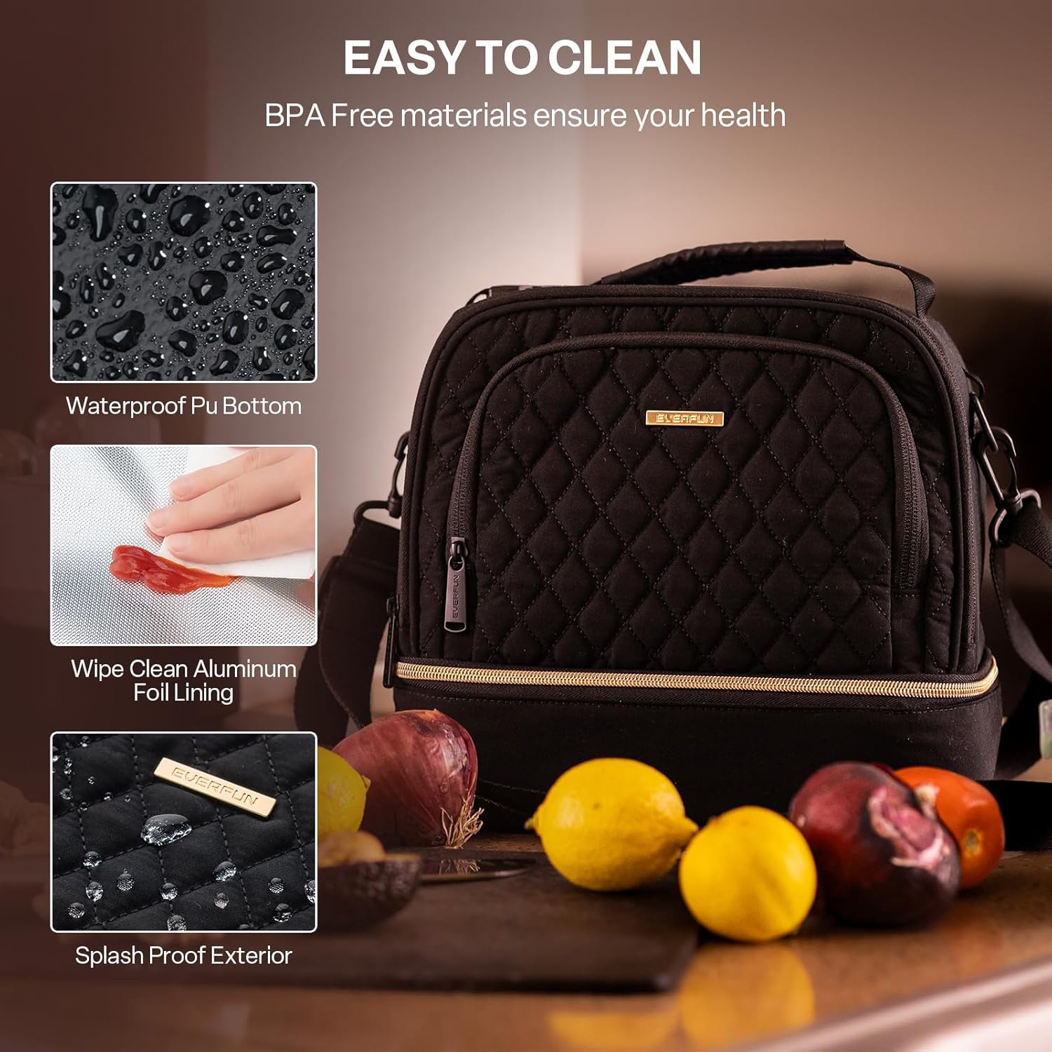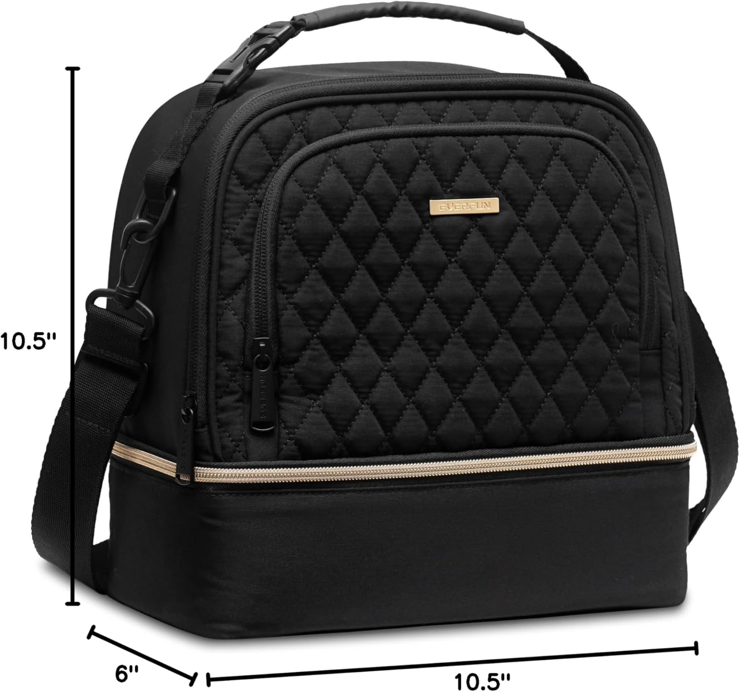 Everfun Womens Lunch Box Two Compartments Insulated Lunch Tote Bag Large Leakproof Soft Cooler for Work Picnic Travel, Black