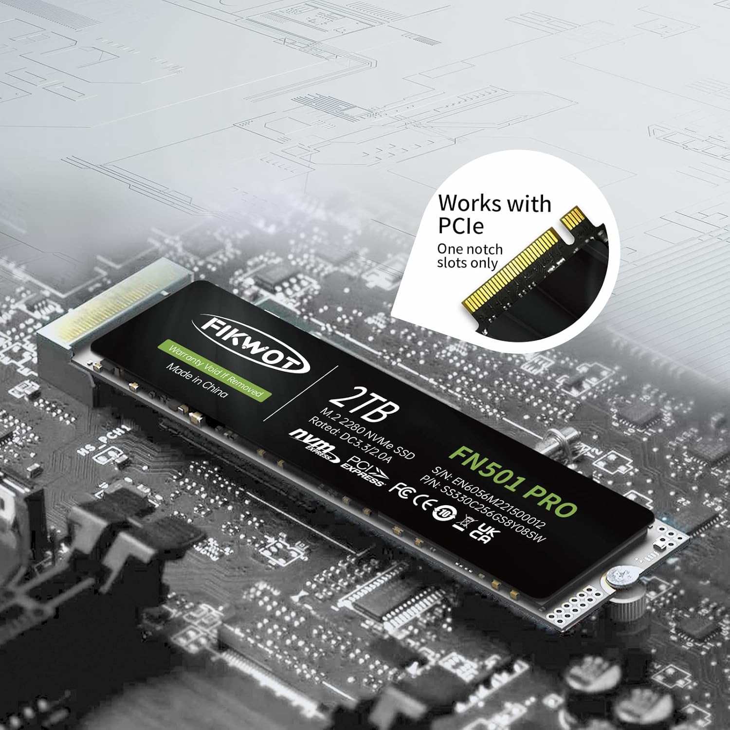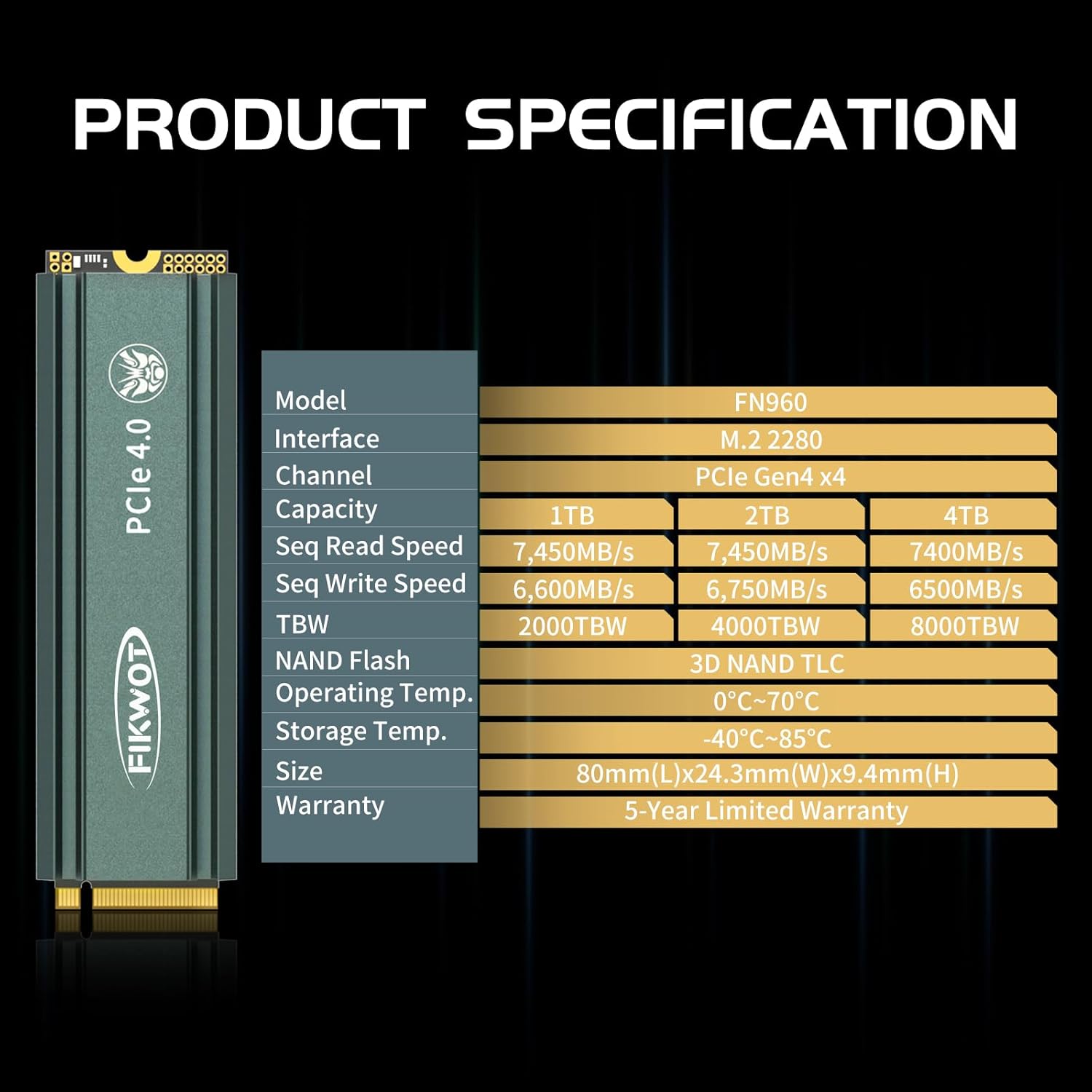 - EXCELLENT PERFORMANCE - Fikwot FN970 2TB M.2 SSD adopts M.2 PCIe Gen4 x4 technology and is compatible with NVMe1.4 protocol. The maximum read speed of this SSD is as high as 7,400MB/s, and the maximum write speed is as high as 6,800MB/s. It is equipped with a dynamic SLC cache to effectively maintain the high-speed operation and stability of the SSD.