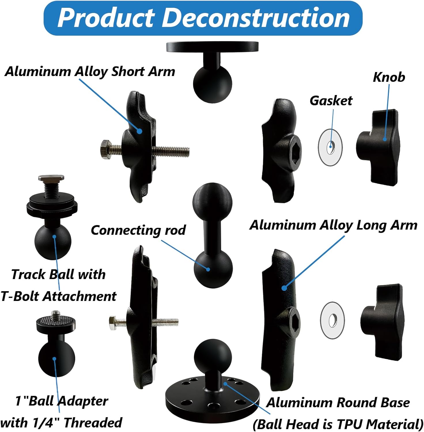 - Multiple Combinations: The fish finder bracket set includes: long aluminum arm x1, short aluminum arm x1, aluminum rould base x2, 1" ball adapter with 1/4"-20 x25" thread x1, aluminum 25mm ball to ball x1, track ball with T-bolt x1. It can be freely combined into fish finder brackets, monitor brackets and other forms