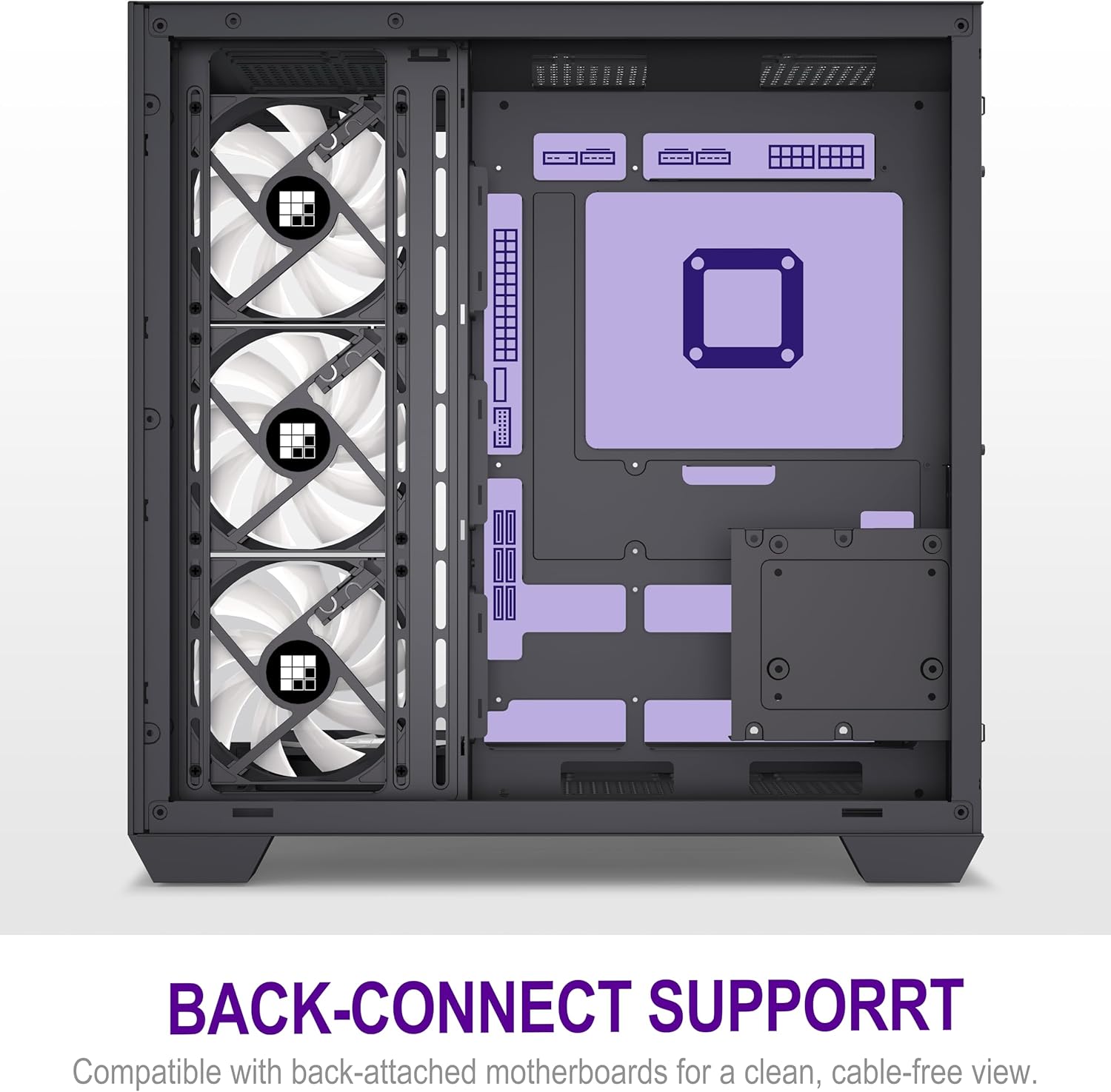 【High Performance Cooling】F600 is pre-installed with 7 ARGB PWM reverse fans, and the glass side panel adopts a hinged design, which can be quickly removed without tools, bringing convenient installation and heat dissipation experience. Up to 10 120mm fans can be accommodated on the sides, tops, and PSU fan mounting points of your computer case, ensuring that you don't sacrifice cooling for the stunning appearance of the glass panel.