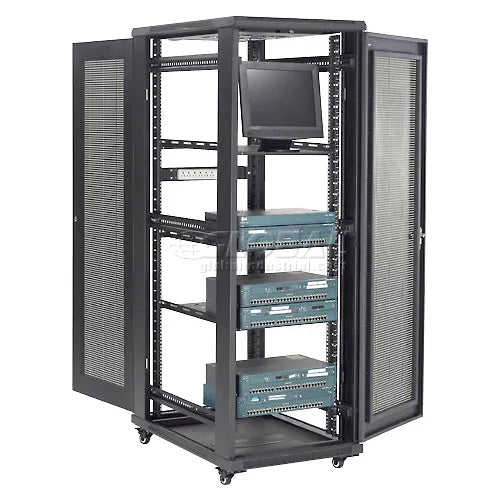 Data Network Cabinet protects network servers and sensitive telecom equipment from unauthorized access, dust and damage. Rack cabinet supports rack-mountable servers and options. Heavy gauge steel data cabinet includes interior mounting channels and hardware. Front and rear locking doors and removable side panels permit full access and doors are perforated for ventilation. Includes 115 volt, UL listed power strip on mounting panel. Rack conforms to the industry standard for 19"W type A rack cabinets. Leveling feet. Black powder coat finish. Overall measures 24"W x 36"D x 72"H. Easy assembly.