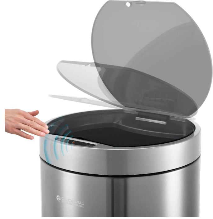 Keep germs in the can and not on your hands with the Global Industrial™ Round Motion Sensor Trash Can. This sleek receptacle is made of brushed stainless steel that's fingerprint-resistant, along with a lid that's equipped with a built-in automatic sensor, allowing users to dispose of trash virtually hands-free. The compact and upright design of the receptacle is perfect for use in commercial spaces, personal kitchens, or health clubs. The liner material is made of resilient and thick polypropylene to help endure high temperatures. Batteries not included. 1 Year Limited Warranty. Measures: 27-9/16" H x 12-5/8" W x 12-5/8" L.