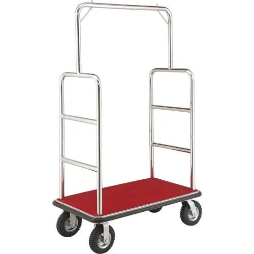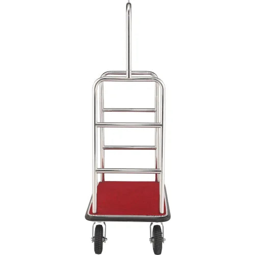Luggage cart is made using corrosion resistant #201 stainless steel uprights and framing. Heavy duty tubular stainless steel frame is cross braced for added reinforcement. Straight Upright Cart offers the industry standard look for luggage carts. Top of the cart includes a garment bar for hanging wardrobe. Bottom stainless steel deck is covered with a slip resistant carpeted surface to protect luggage and suitcases. Protective deck bumper prevents marring of walls and doorways. Moves easily on 2 swivel, 2 rigid casters. Easy assembly.
