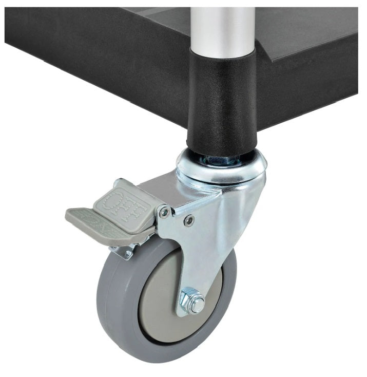 Move everything from office supplies and bulk materials to food and drinks. This warehouse cart with aluminum upright boasts double ball bearing swivel casters that are non-marking and feature total lock brakes. A mobile cart with ball bearing is easy to maneuver, and this one features a 440- lb. capacity for light jobs. Each shelf holds up to 220 lb., and there's a 1" lip designed on the back and sides for added security. This unit makes the perfect rolling cart for the food and beverage industry, but its versatility allows it to serve a variety of purposes.
