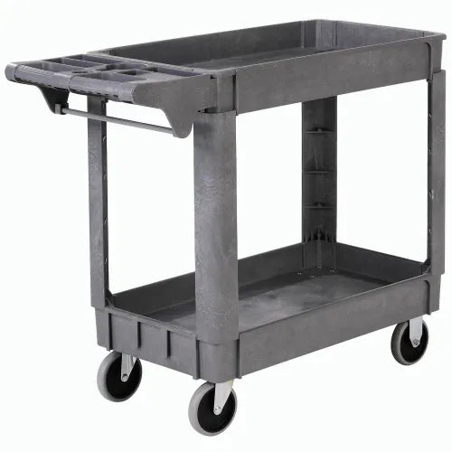 Heavy duty, tough structural foam plastic construction resists scratches, dents and cleans easily. 3" deep trays help to retain cargo during transit. Lightweight, quiet rolling cart maneuvers easily on 2 swivel, 2 rigid 5" rubber casters. Assembles easily. Personalize your plastic utility service cart with our great accessories. 1 Year Limited Warranty.