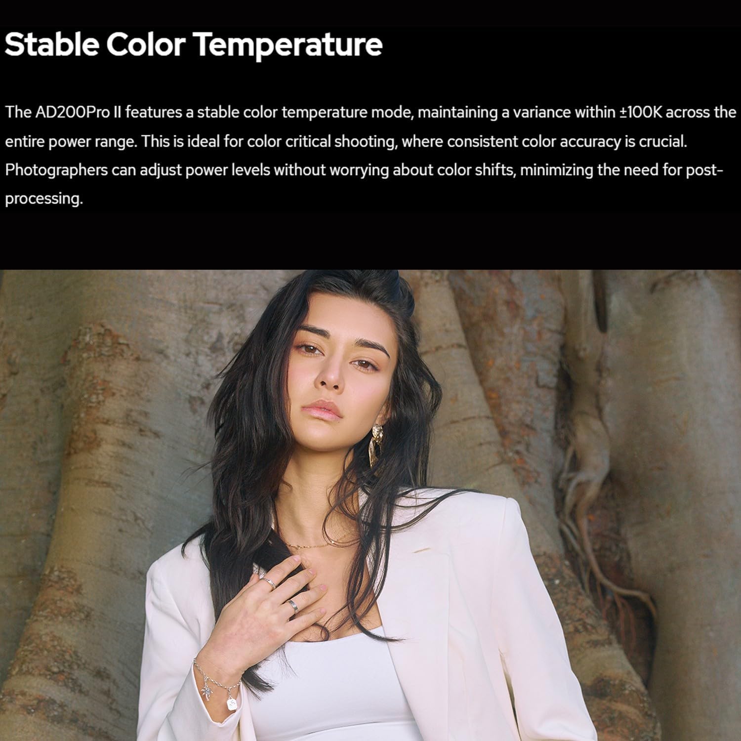 Stable Color Temperature: The AD200Pro II features a stable color temperature mode, maintaining a variance within ±100K across the entire power range. This is ideal for color critical shooting, where consistent color accuracy is crucial. Photographers can adjust power levels without worrying about color shifts, minimizing the need for post-processing