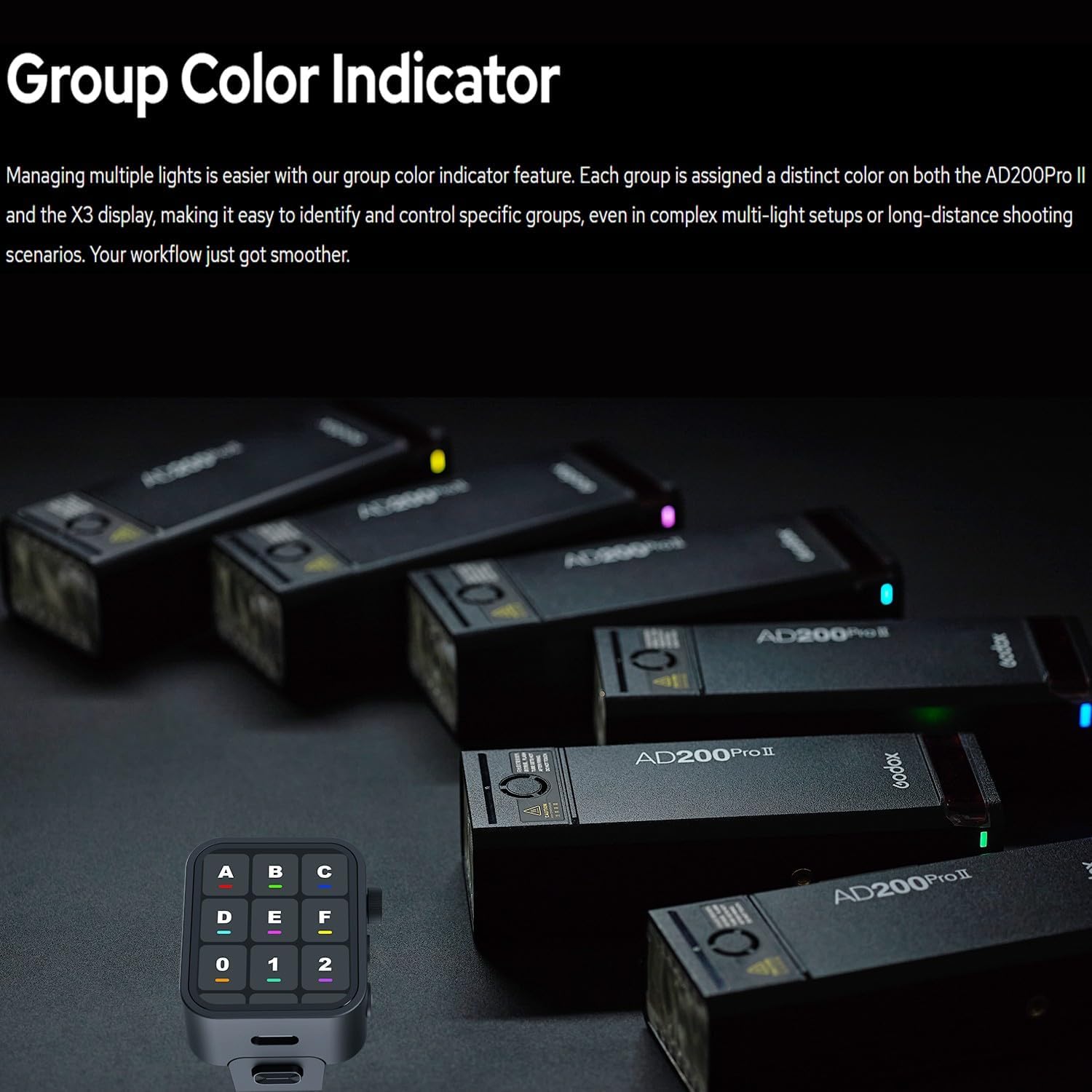 Group Color Indicator: Managing multiple lights is easier with our group color indicator feature. Each group is assigned a distinct color on both the AD200Pro II and the X3 display, making it easy to identify and control specific groups, even in complex multi-light setups or long-distance shooting scenarios. Your workflow just got smoother