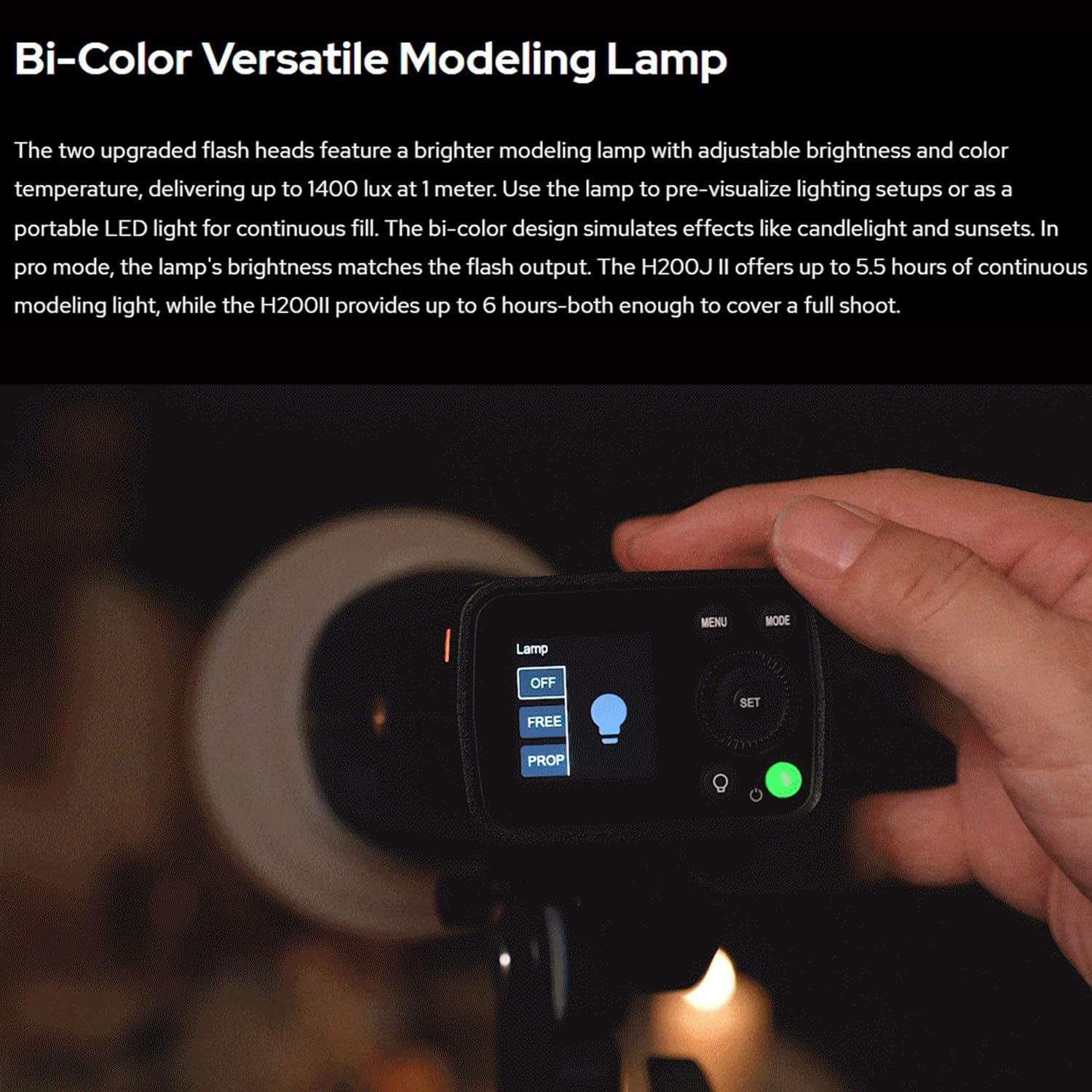 Bi-Color Versatile Modeling Lamp: The two upgraded flash heads feature a brighter modeling lamp with adjustable brightness and color temperature, delivering up to 1400 lux at 1 meter. In pro mode, the lamp's brightness matches the flash output. The H200J II offers up to 5.5 hours of continuous modeling light, while the H200II provides up to 6 hours-both enough to cover a full shoot