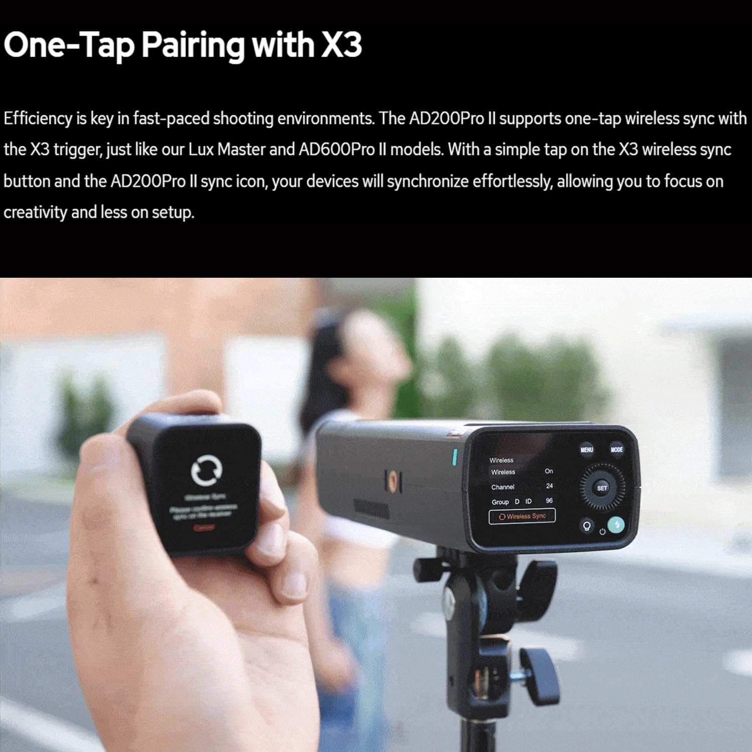 One-Tap Pairing with X3: The AD200Pro II supports one-tap wireless sync with the X3 trigger, just like our Lux Master and AD600Pro II models. With a simple tap on the X3 wireless sync button and the AD200Pro II sync icon, your devices will synchronize effortlessly, allowing you to focus on creativity and less on setup