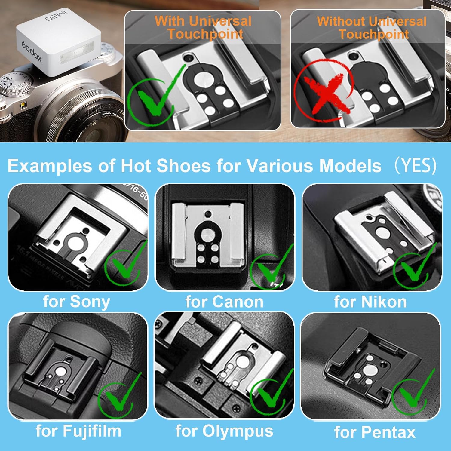 - Please note, the hot shoe contact of these six camera brands must match the examples shown in the image. Be sure to carefully review the hot shoe contact examples in the image before purchasing to ensure compatibility.Camera Compatibility Warning: Godox IM20 mini manual flash is NOT compatible with Sony ZV-1F, A9III, A99, A77, A350. NOT compatible with Canon EOS Rebel SL3, 250D, T7, 1500D, 2000D, T100, 3000D, 4000D, 200DII, R7, R6II, R8, R10, R50. NOT compatible with Fuji X-A3, X100F, X100T. Check the "Camera Compatibility List" in the product photos before purchase to ensure proper compatibility.