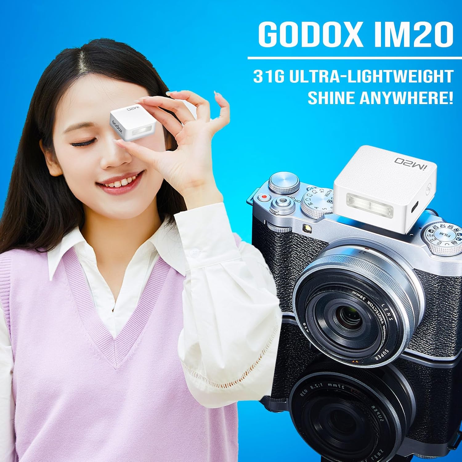 - Lightweight Portability:Weighing a mere 31 grams, the iM20 flash is a marvel of lightweight design. Its compact form seamlessly integrates with your camera, making it the perfect companion from everyday street photography to travel documentation. The light and small Godox IM20 camera flash is more suitable and convenient to use with Sony ZV1/Sony zve10/Ricoh gr3/FUJI F1 or other camera.