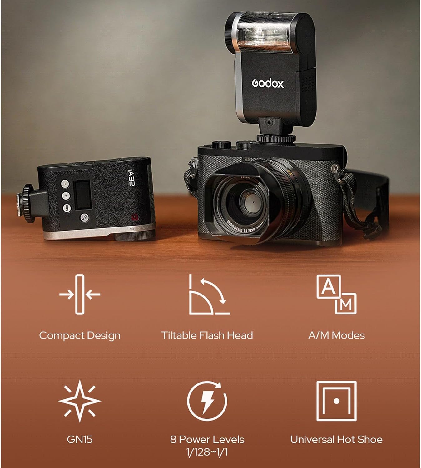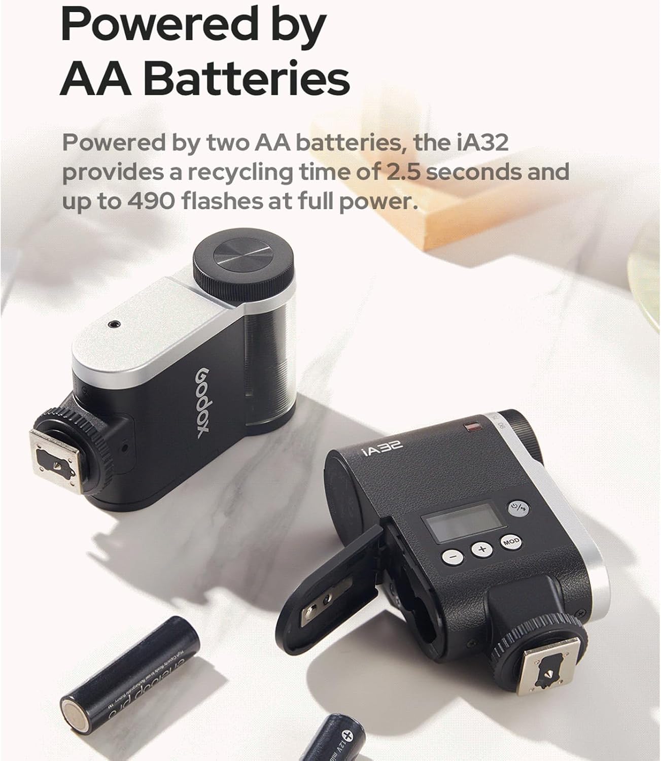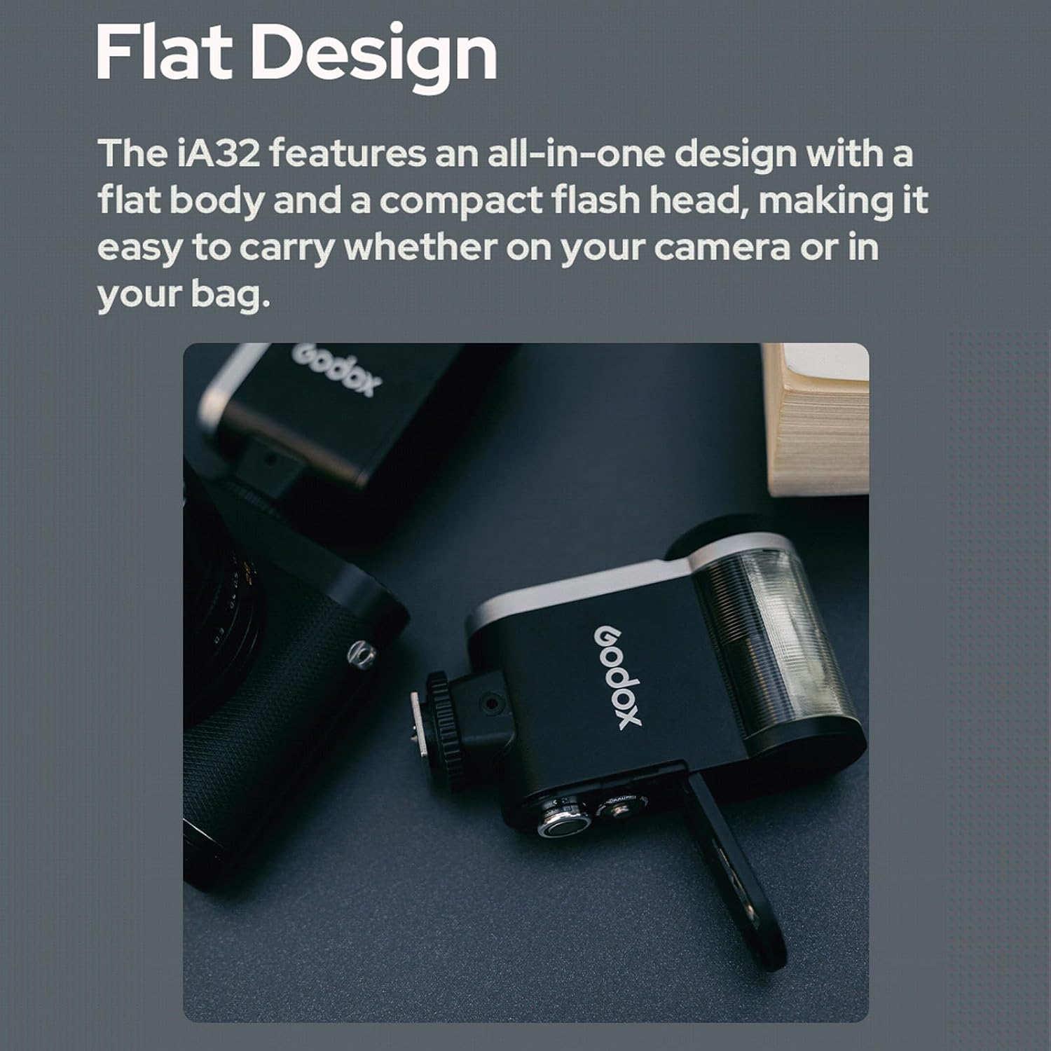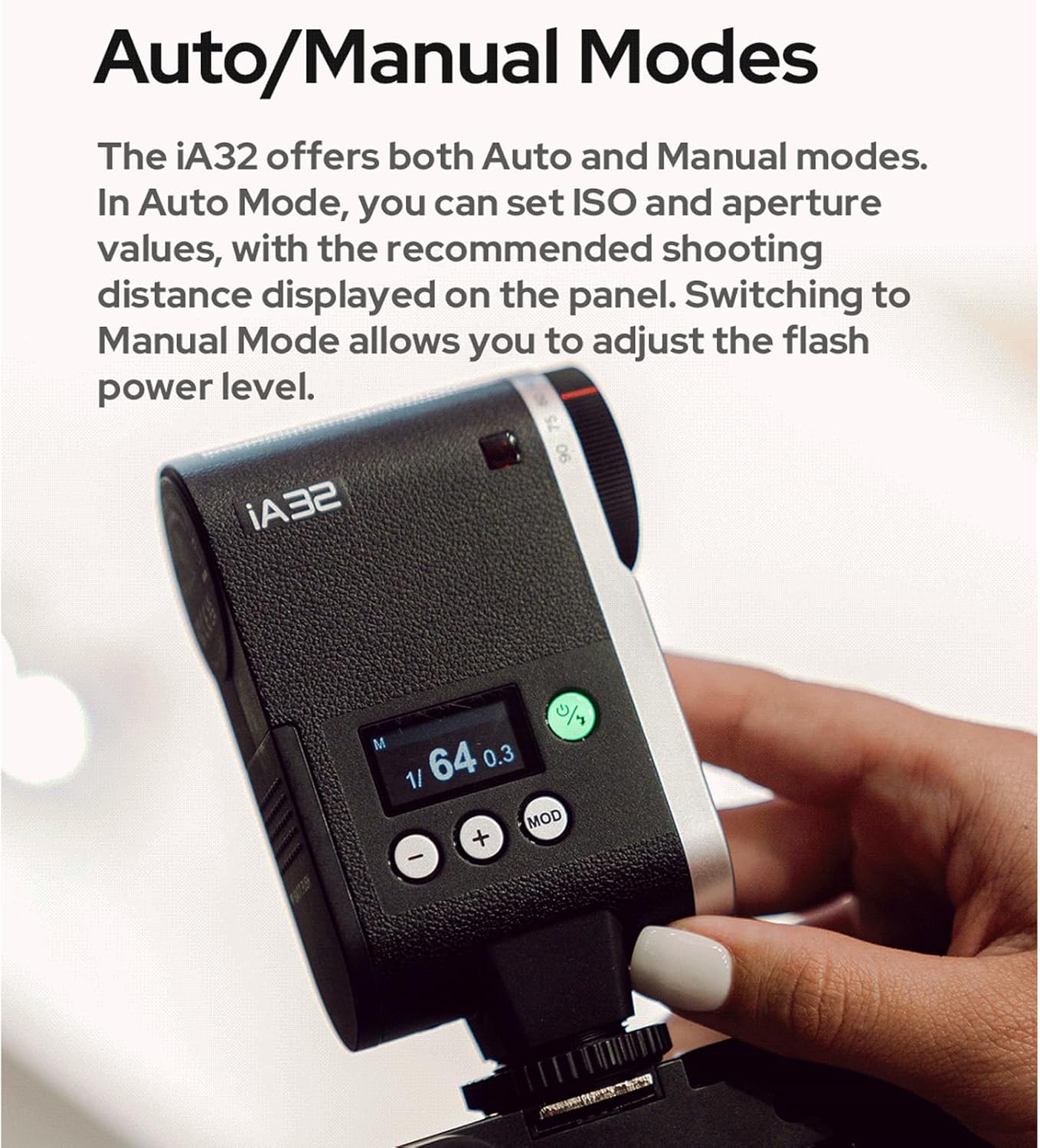 - 【Let Each Memory Glow】 Introducing the iA32, the latest member of the GodoxiFlash family.With its integrated flat design, the iA32 stays attached to your camera ready to go anywhere.lts adjustable flash tube offers a -7° to 90° range,easily controlled by the side dial.The iA32 supports both Auto and Manual modes, providing flexibility for different shooting needs.