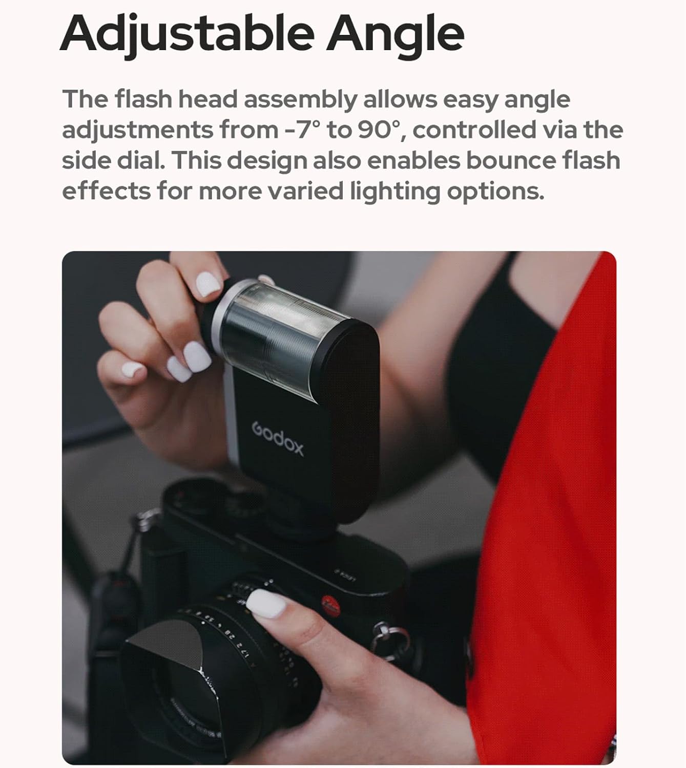 - 【Adjustable Angle 】 The flash head assembly allows easy angle adjustments from -7° to 90°, controlled via the side dial. This design also enables bounce flash effects for more varied lighting options.