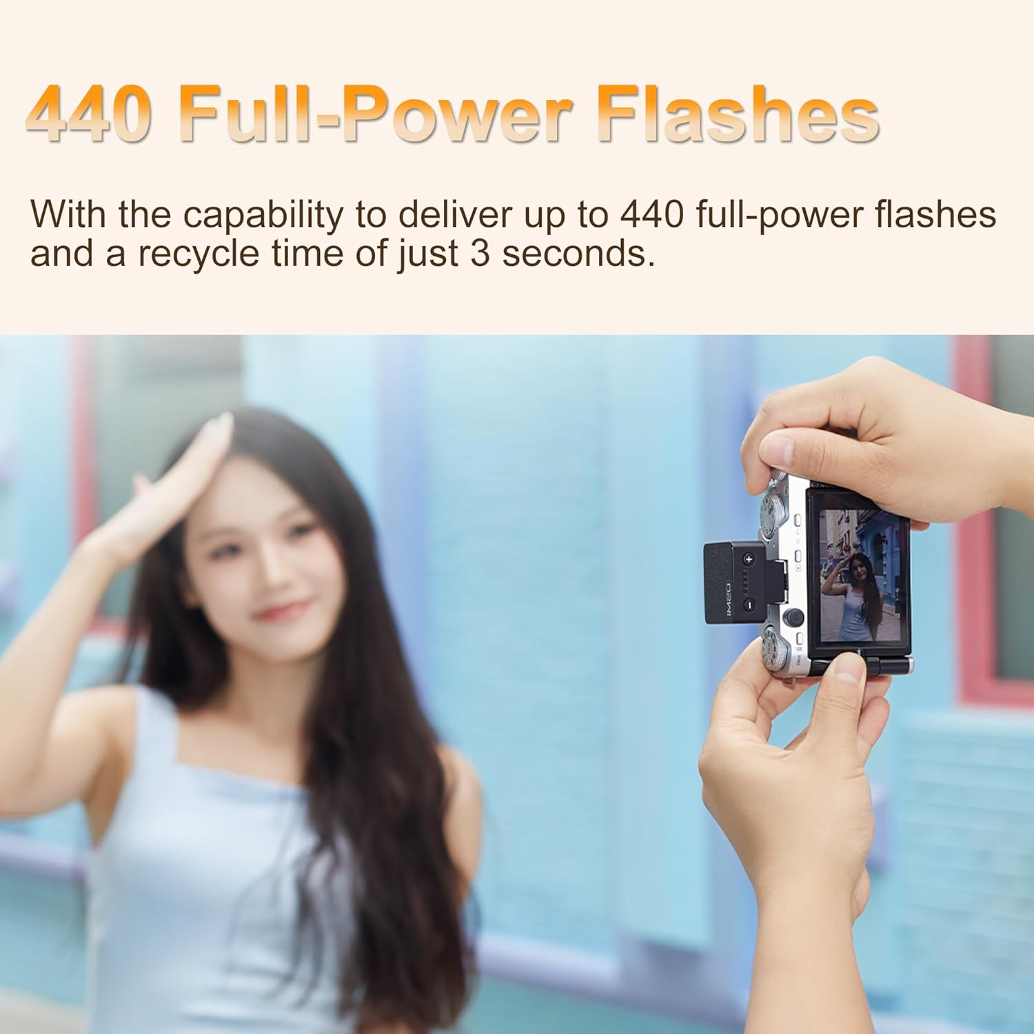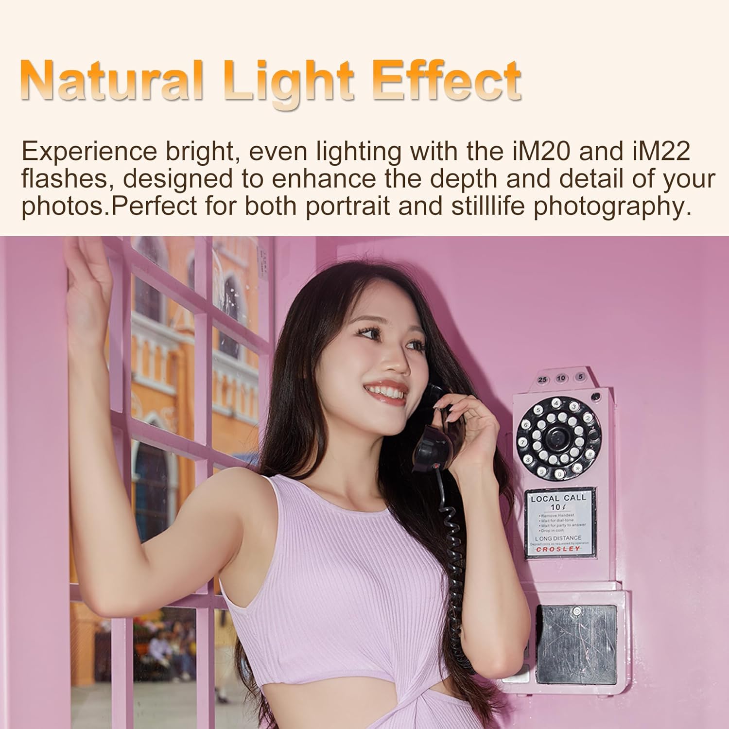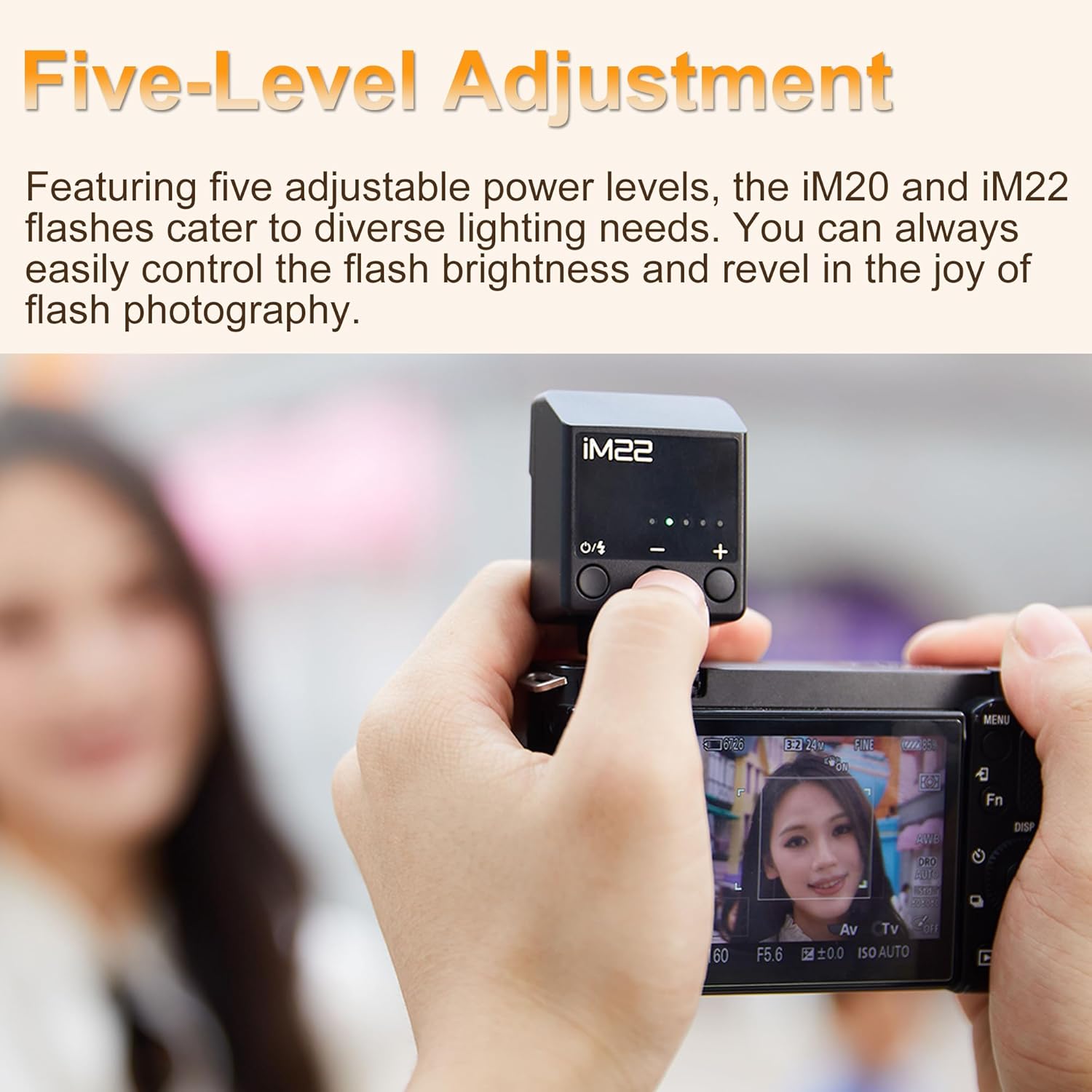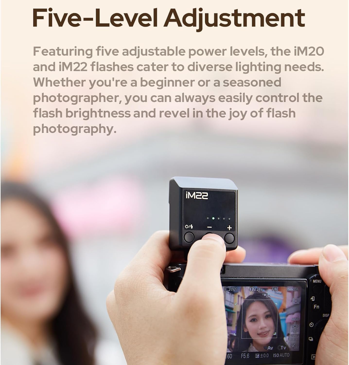 【Replaceable Battery,230 flashes】 Powered by two AAA batteries, the iM20 is easy to recharge or replace, so you never miss a moment. Full of Energy,The iM20 is built to keep up with your creativity, delivering up to 230 flashes on a single charge. Stay ready to capture every moment without worrying about running out of power.