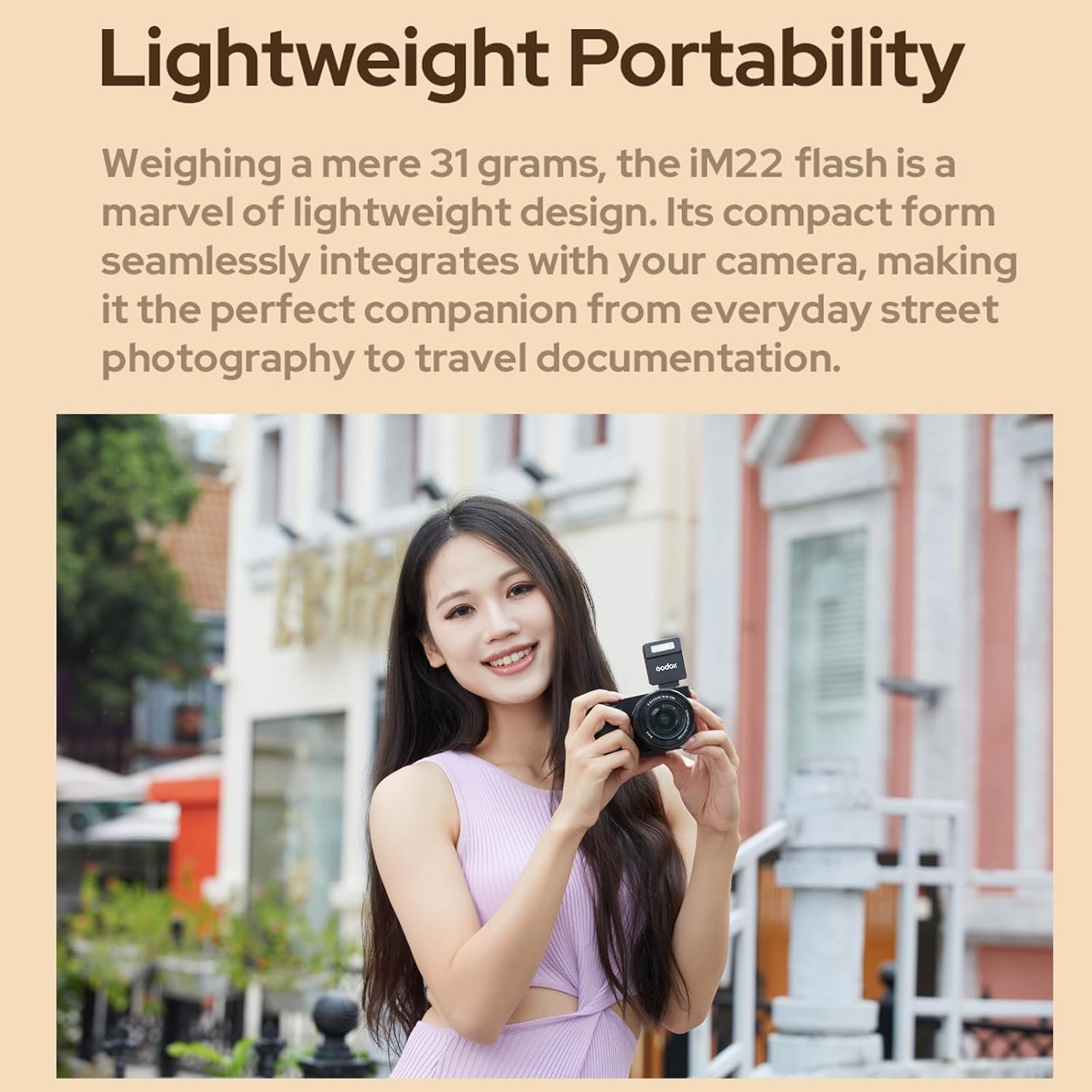 【Small Build, Bright Filed】Meet the new Godox iM20 on-camera flash. Its compact size means you can easily slip it into your pocket or mount it on your camera, ready to go wherever you do. Whether it’s a sunny day or cloudy, this flash is your ideal companion—lightweight and never a burden.