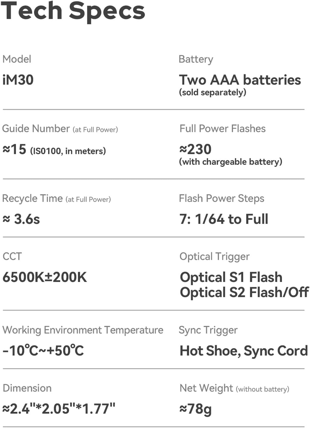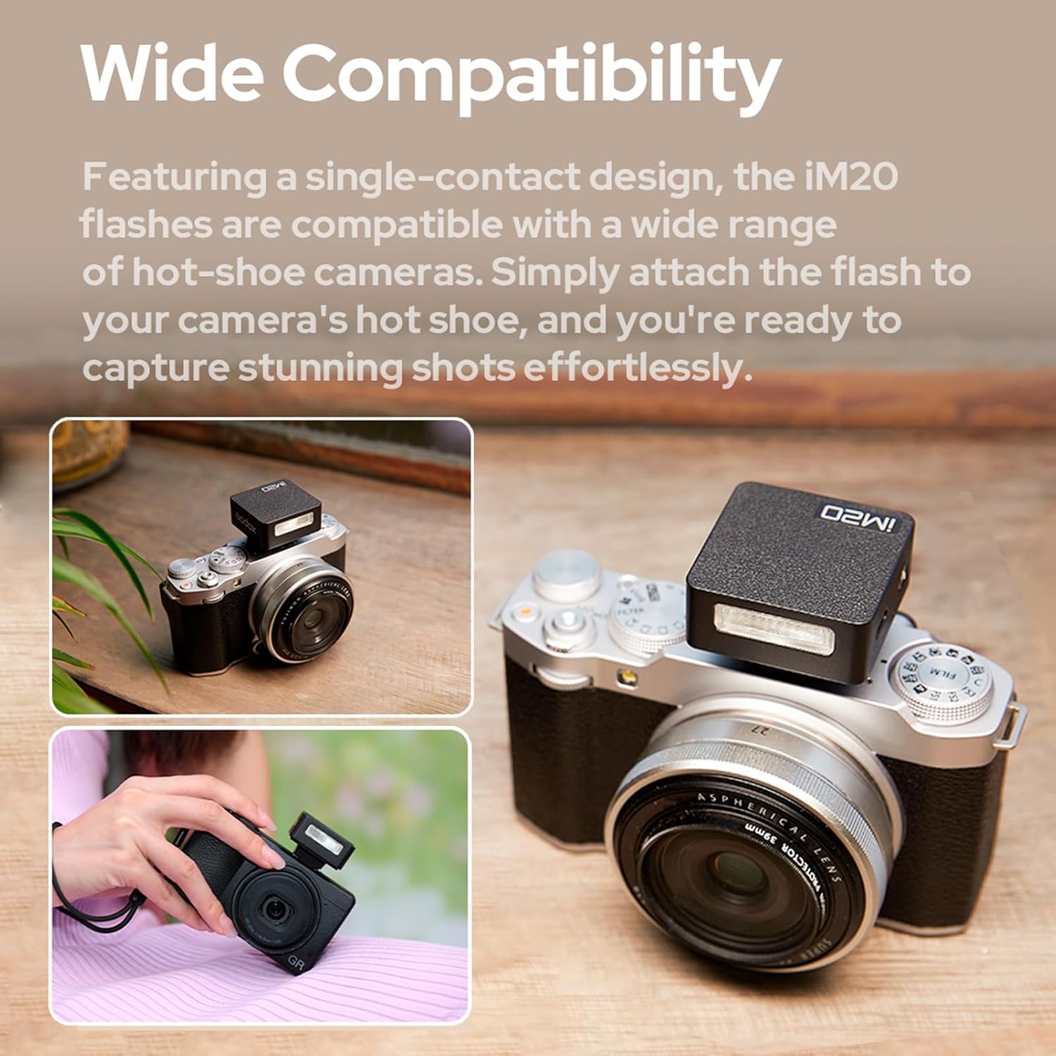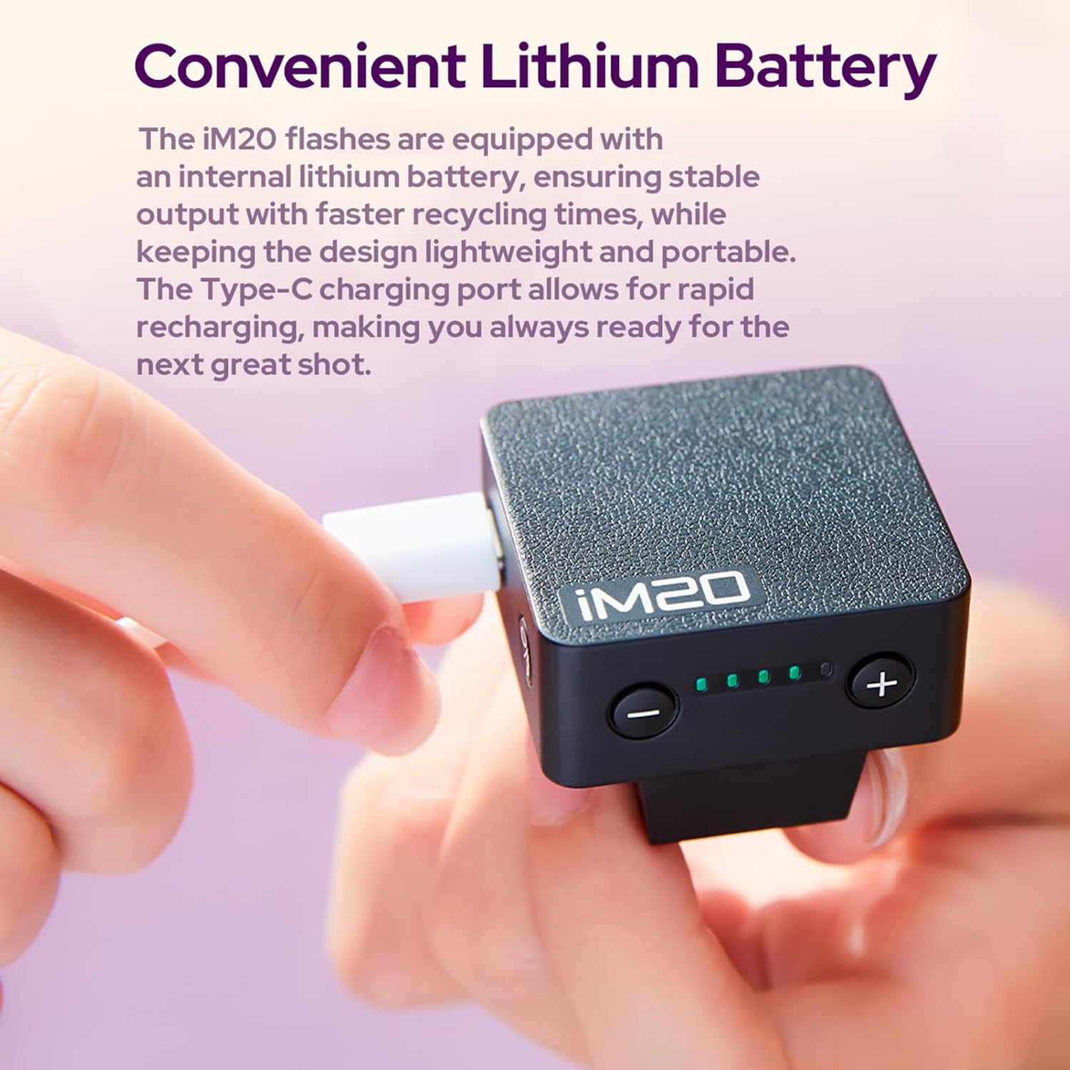 - 【Full of Energy】The iM30 camera flash is built to keep up with your creativity, delivering up to 230 flashes on a single charge. Stay ready to capture every moment without worrying about running out of power.