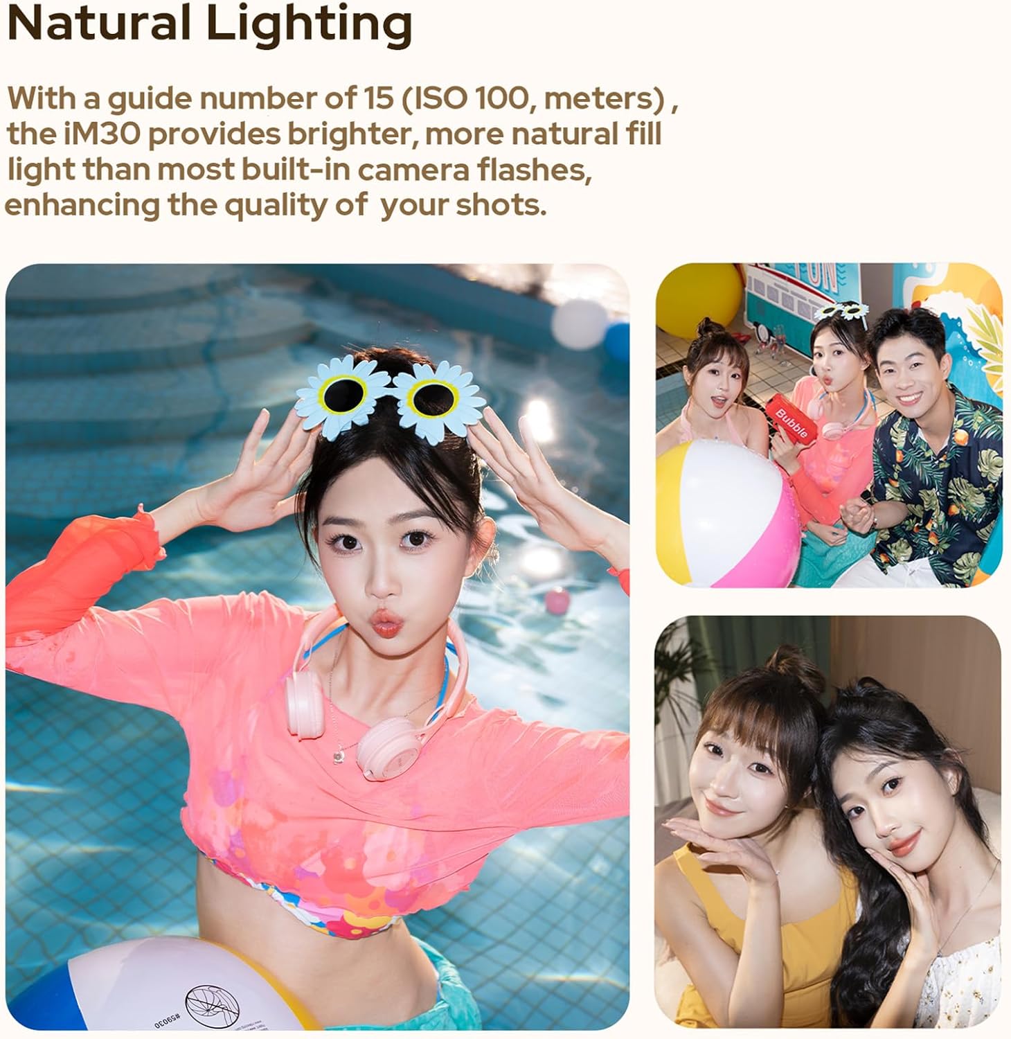 - 【Natural Lighting】With a guide number of 15 (ISO 100, meters), the iM30 provides brighter, more natural fill light than most built-in camera flashes, enhancing the quality of your photos.