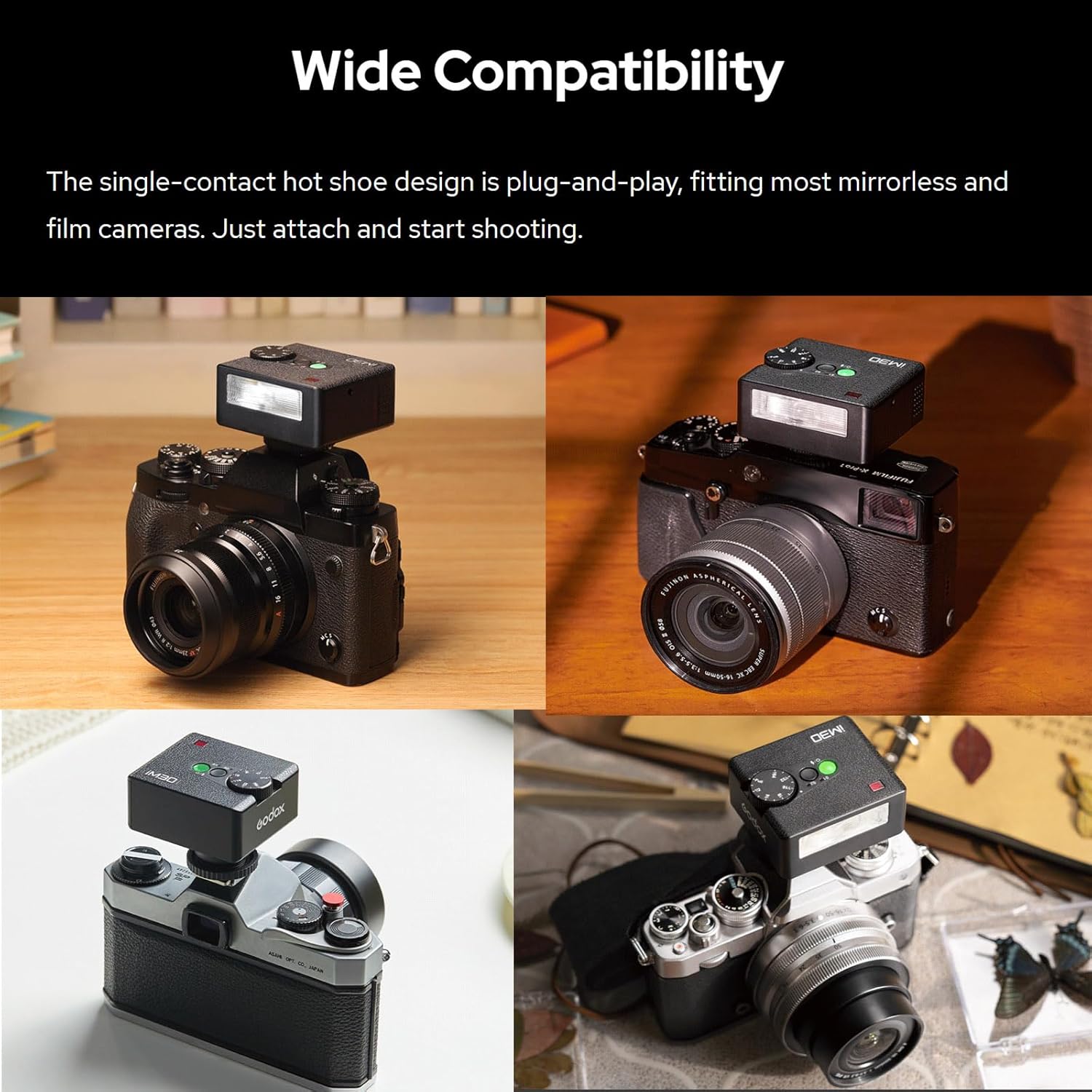 - [Wide Compatibility,Natural Lighting] The single-contact hot shoe design is plug-and-play, fitting most mirrorless and film cameras. Just attach and start shooting.With a guide number of 15 (ISO 100, meters) , the iM30 provides brighter, more natural fill light than most built-in camera flashes, enhancing the quality of your shots.