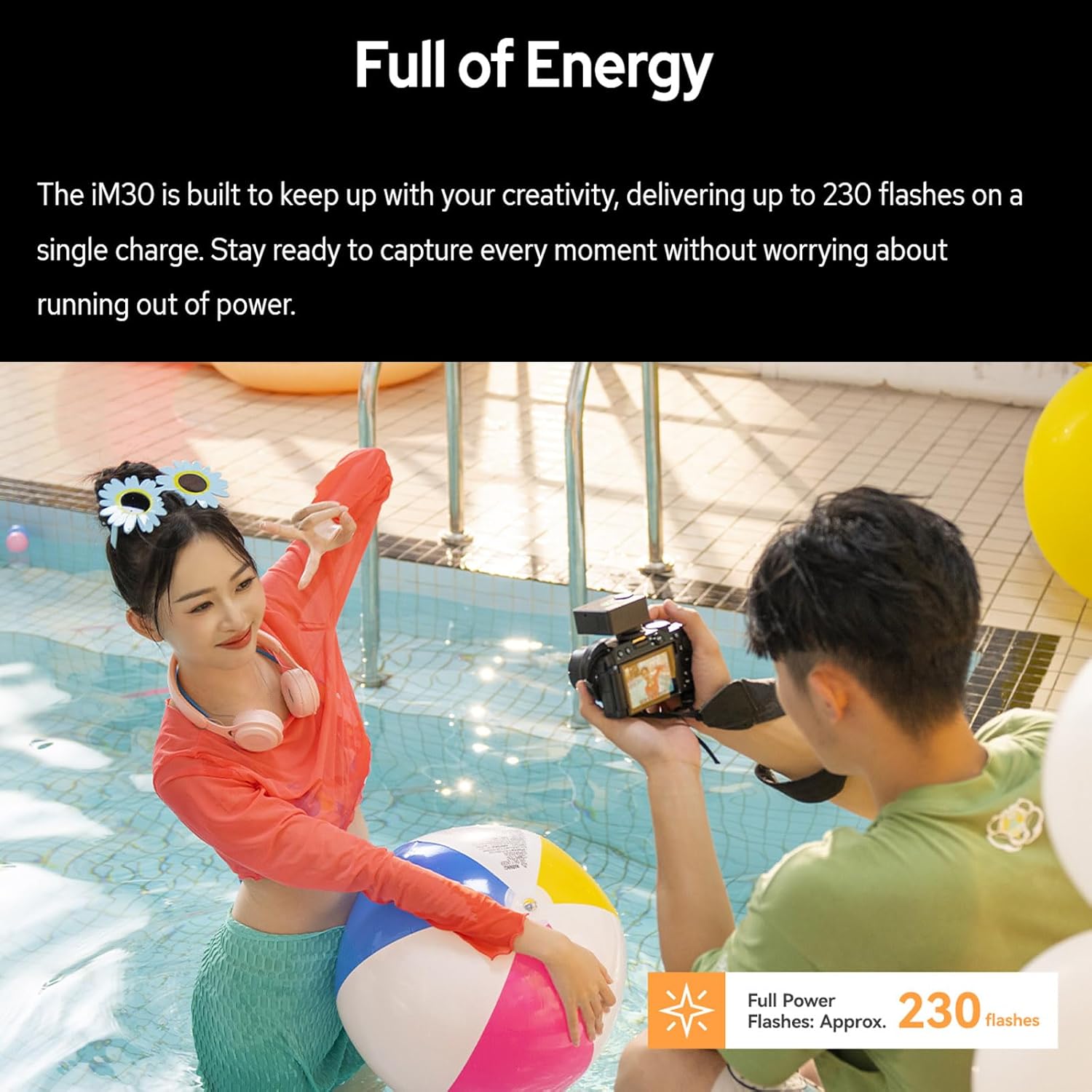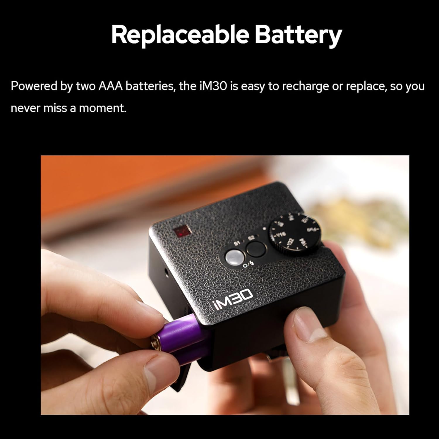 - [Replaceable Battery,230 flashes] Powered by two AAA batteries, the iM30 is easy to recharge or replace, so you never miss a moment.Full of Energy,The iM30 is built to keep up with your creativity, delivering up to 230 flashes on a single charge. Stay ready to capture every moment without worrying about running out of power.