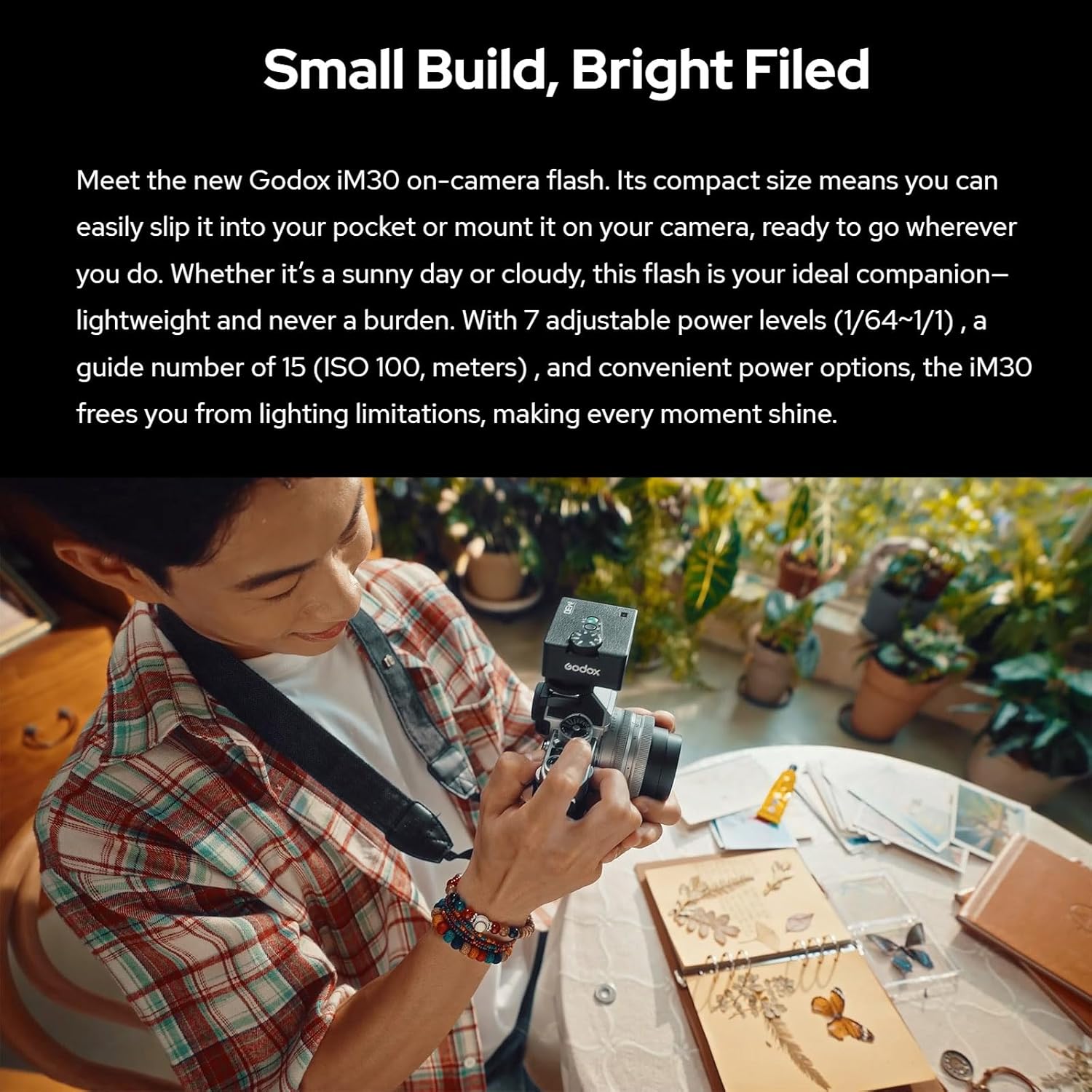 - [Small Build, Bright Filed] Meet the new Godox iM30 on-camera flash. Its compact size means you can easily slip it into your pocket or mount it on your camera, ready to go wherever you do. Whether it’s a sunny day or cloudy, this flash is your ideal companion—lightweight and never a burden. With 7 adjustable power levels (1/64~1/1) , a guide number of 15 (ISO 100, meters) , and convenient power options, the iM30 frees you from lighting limitations, making every moment shine.