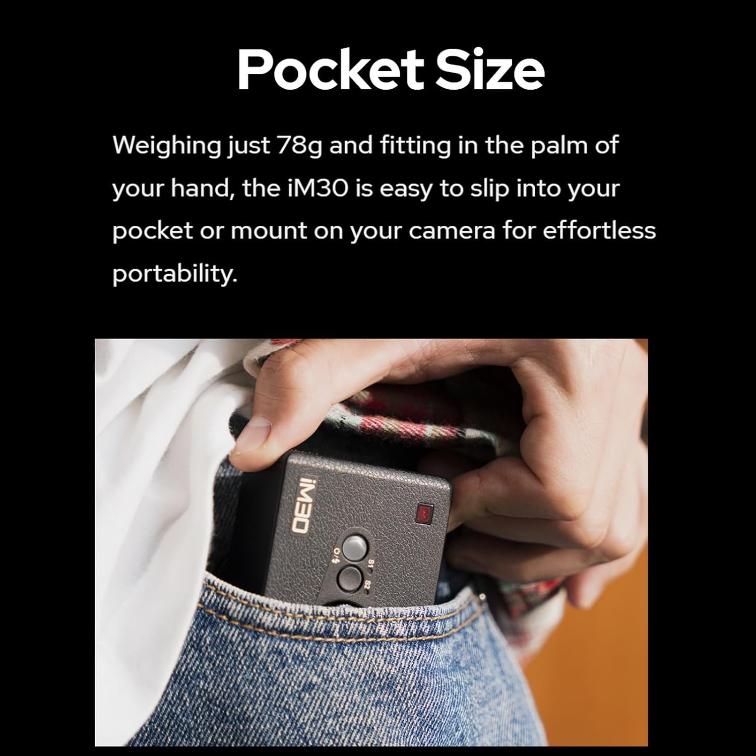 - [Pocket Size] Weighing just 78g and fitting in the palm of your hand, the iM30 is easy to slip into your pocket or mount on your camera for effortless portability.