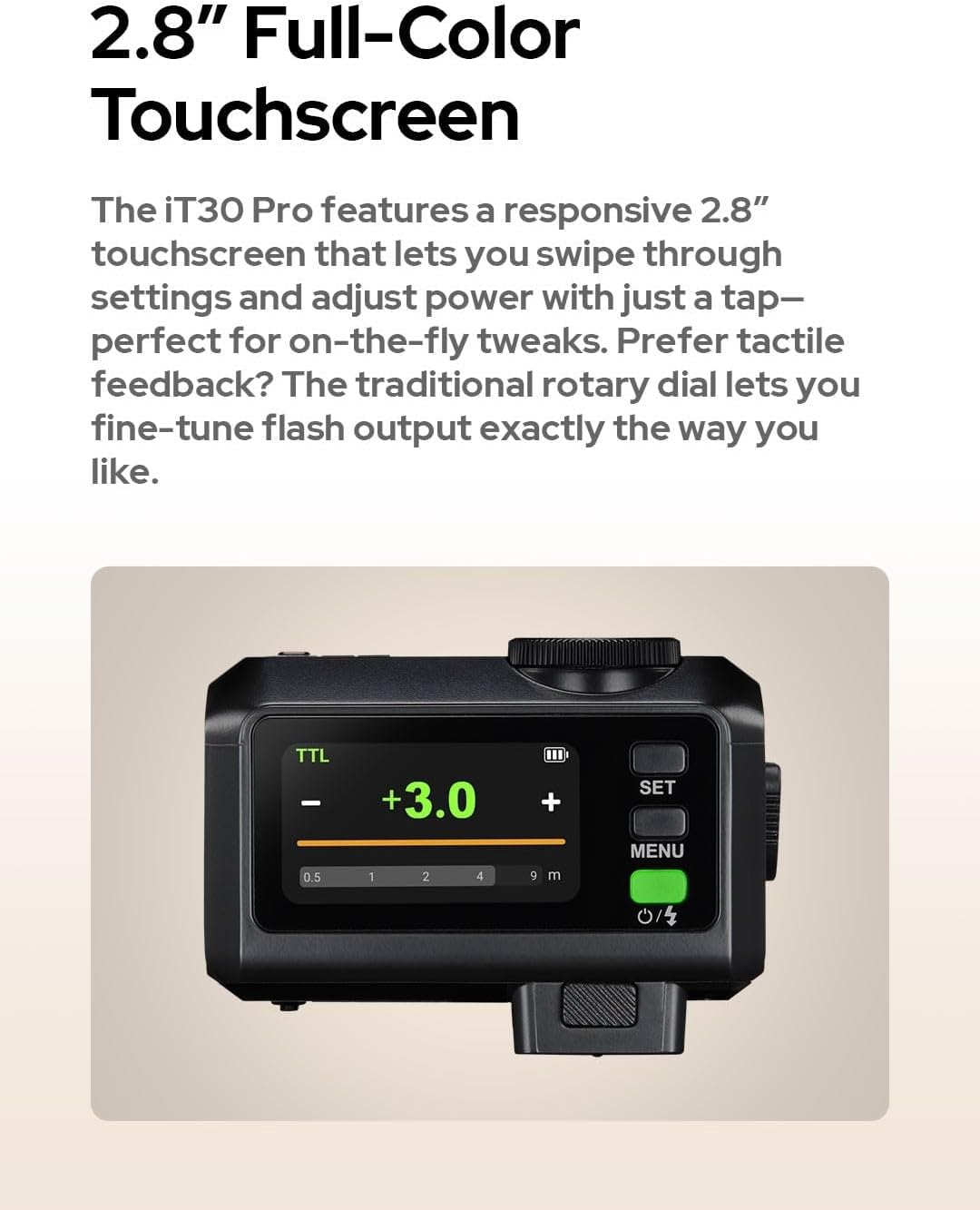 - The iT30 Pro features a responsive 2.8″ touchscreen that lets you swipe through settings and adjust power with just a tap—perfect for on-the-fly tweaks. Prefer tactile feedback? The traditional rotary dial lets you fine-tune flash output exactly the way you like.