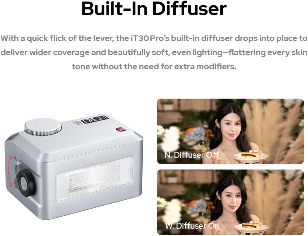 - With a quick flick of the lever, the iT30 Pro’s built-in diffuser drops into place to deliver wider coverage and beautifully soft, even lighting—flattering every skin tone without the need for extra modifiers.