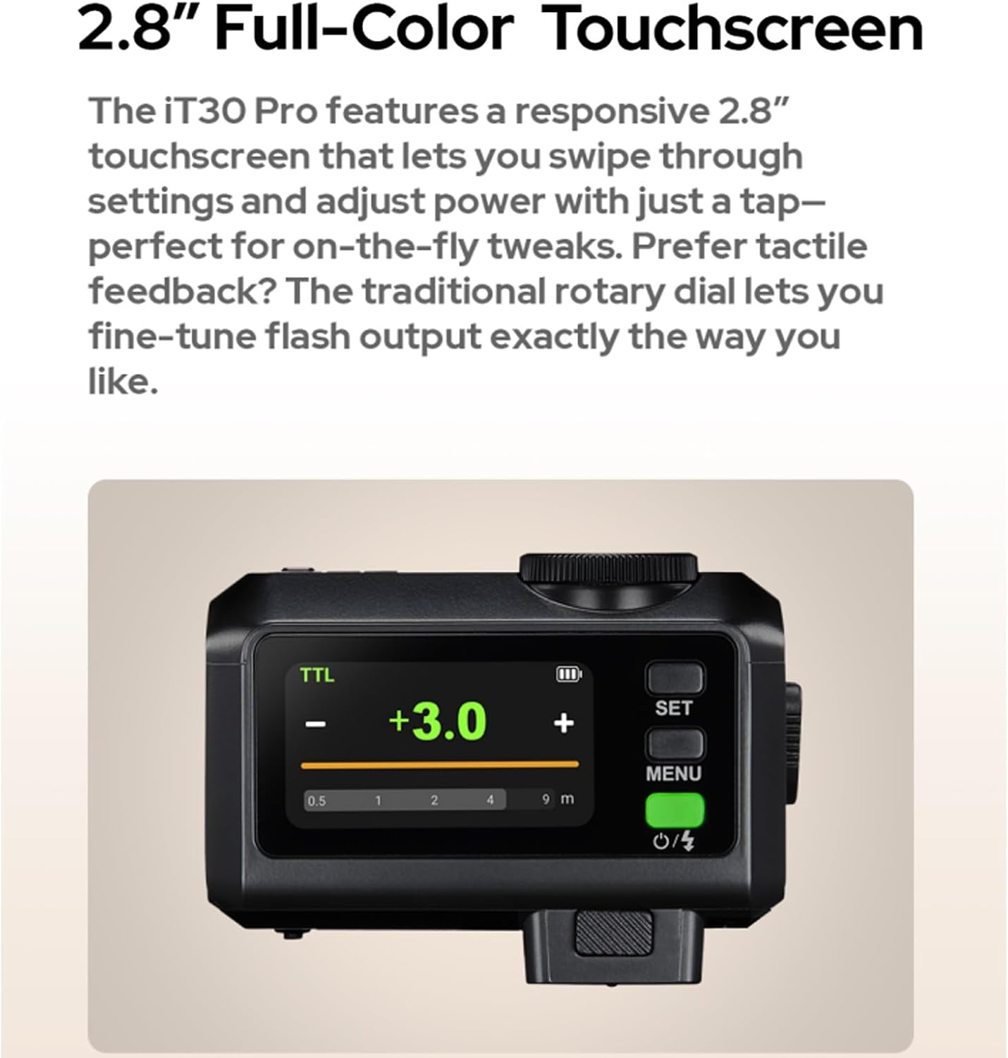 TTL Auto-Exposure: The iT30 Pro’s TTL mode meters light through your lens in real time and instantly calculates the optimal flash output—whether you’re just starting out or you’ve been shooting for years, you’ll get perfectly exposed images every time. Enjoy consistently balanced results in any lighting scenario and focus on your creativity, not your settings.