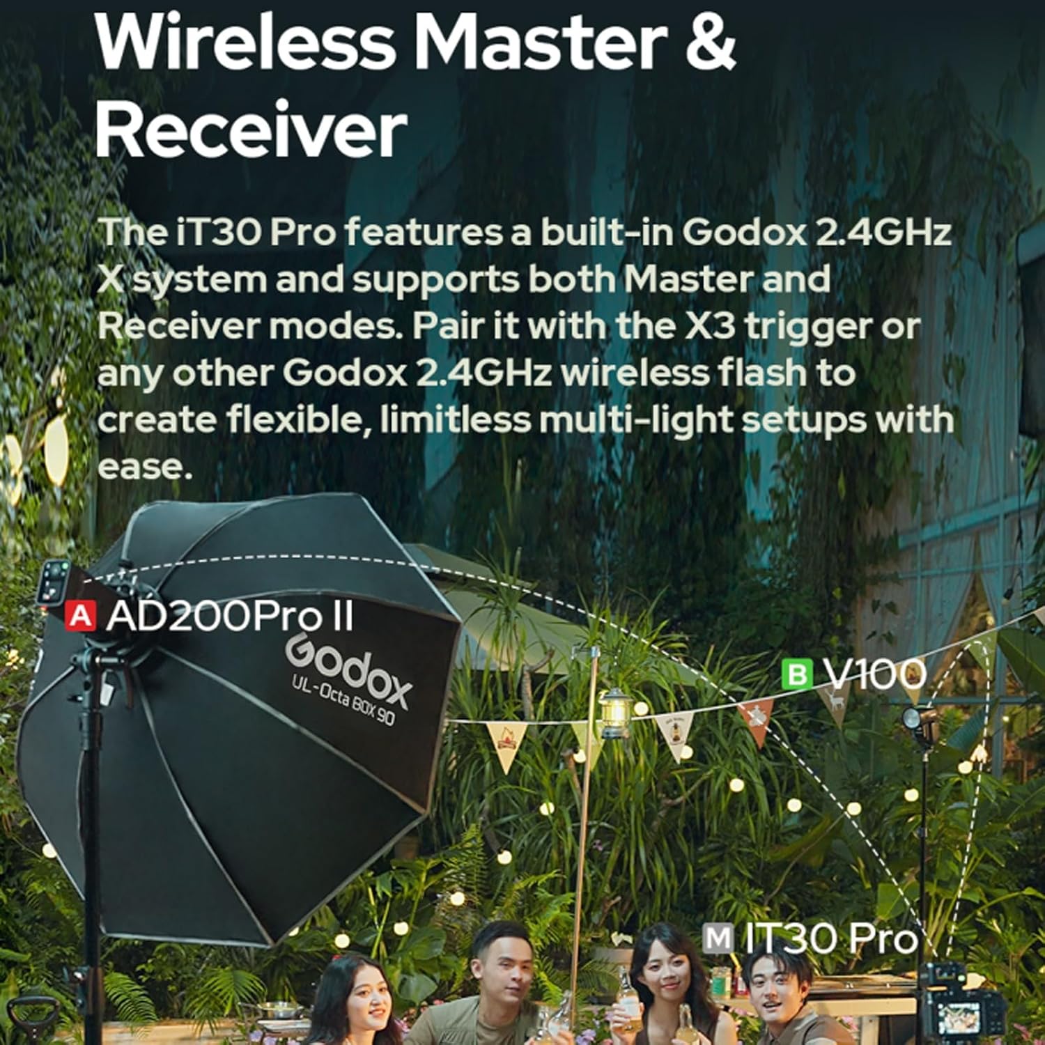 Wireless Master & Receiver: The iT30 Pro features a built-in Godox 2.4GHz X system and supports both Master and Receiver modes. Pair it with the X3 trigger or any other Godox 2.4GHz wireless flash to create flexible, limitless multi-light setups with ease
