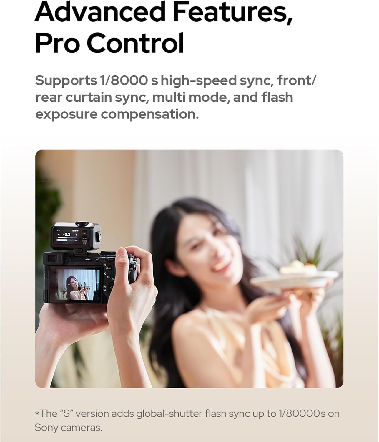 - 【Advanced Features, Pro Control】Supports 1/8000 s high-speed sync, front/rear-curtain sync, multi mode, and flash exposure compensation.*The “S” version adds global-shutter flash sync up to 1/80000 s on Sony cameras.