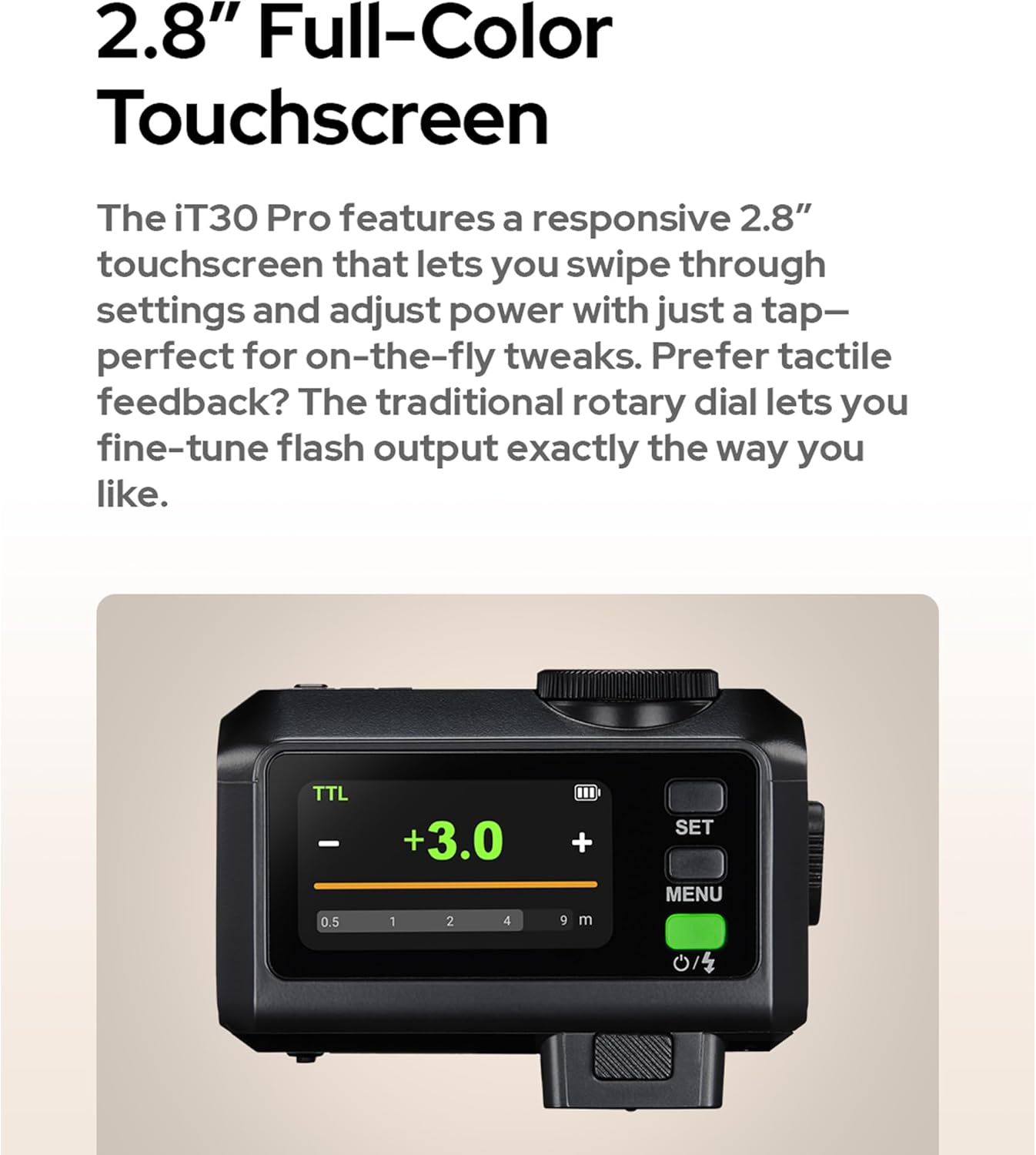 - 【2.8″ Full-Color Touchscreen】The iT30 Pro features a responsive 2.8″ touchscreen that lets you swipe through settings and adjust power with just a tap—perfect for on-the-fly tweaks. Prefer tactile feedback? The traditional rotary dial lets you fine-tune flash output exactly the way you like.
