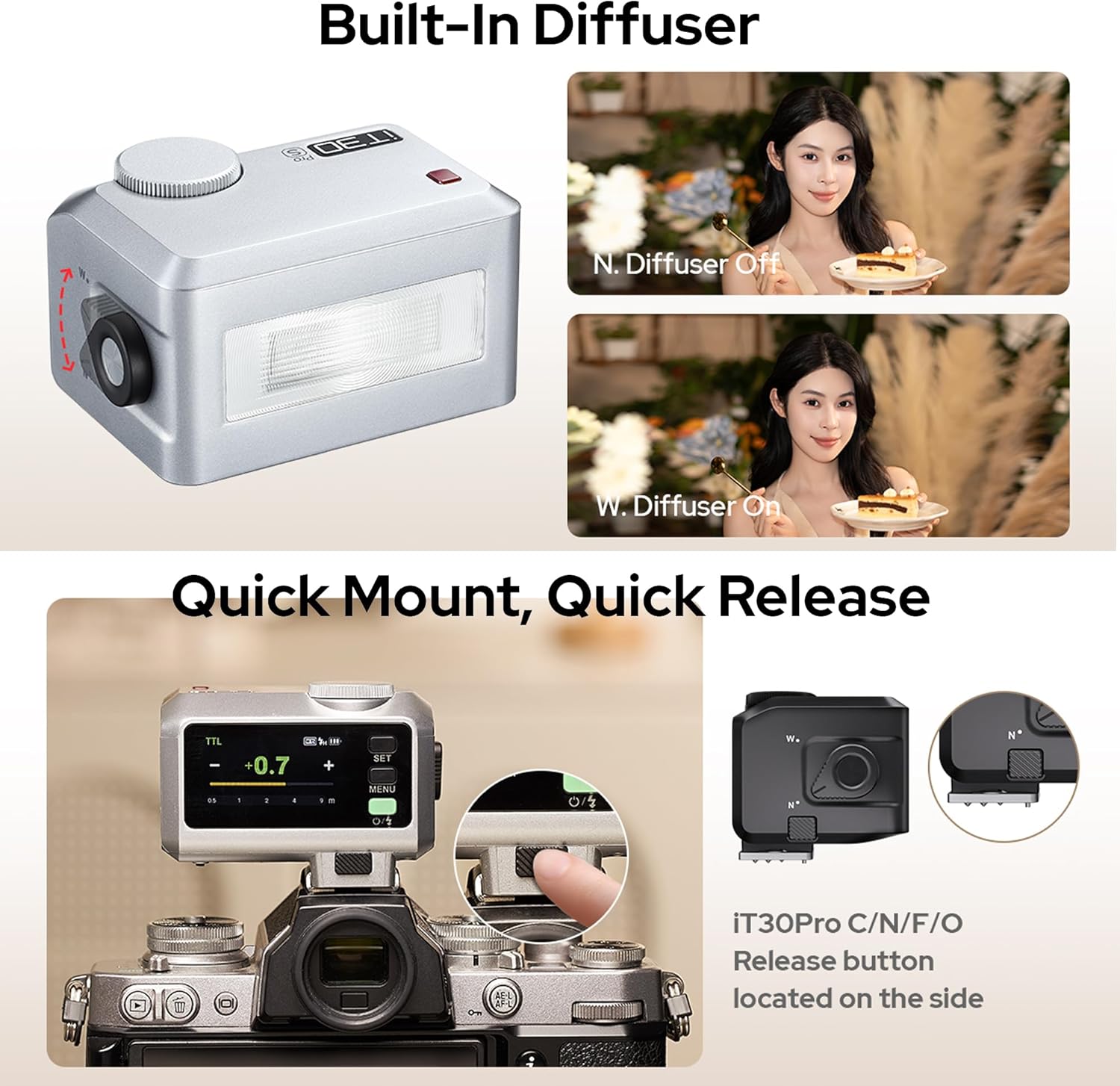 - 【Built-In Diffuser】With a quick flick of the lever, the iT30 Pro’s built-in diffuser drops into place to deliver wider coverage and beautifully soft, even lighting—flattering every skin tone without the need for extra modifiers.Quick Mount, Quick Release,Redesigned quick-release foot lets you lock or remove the flash in a single press—speeding up your workflow on every shoot.