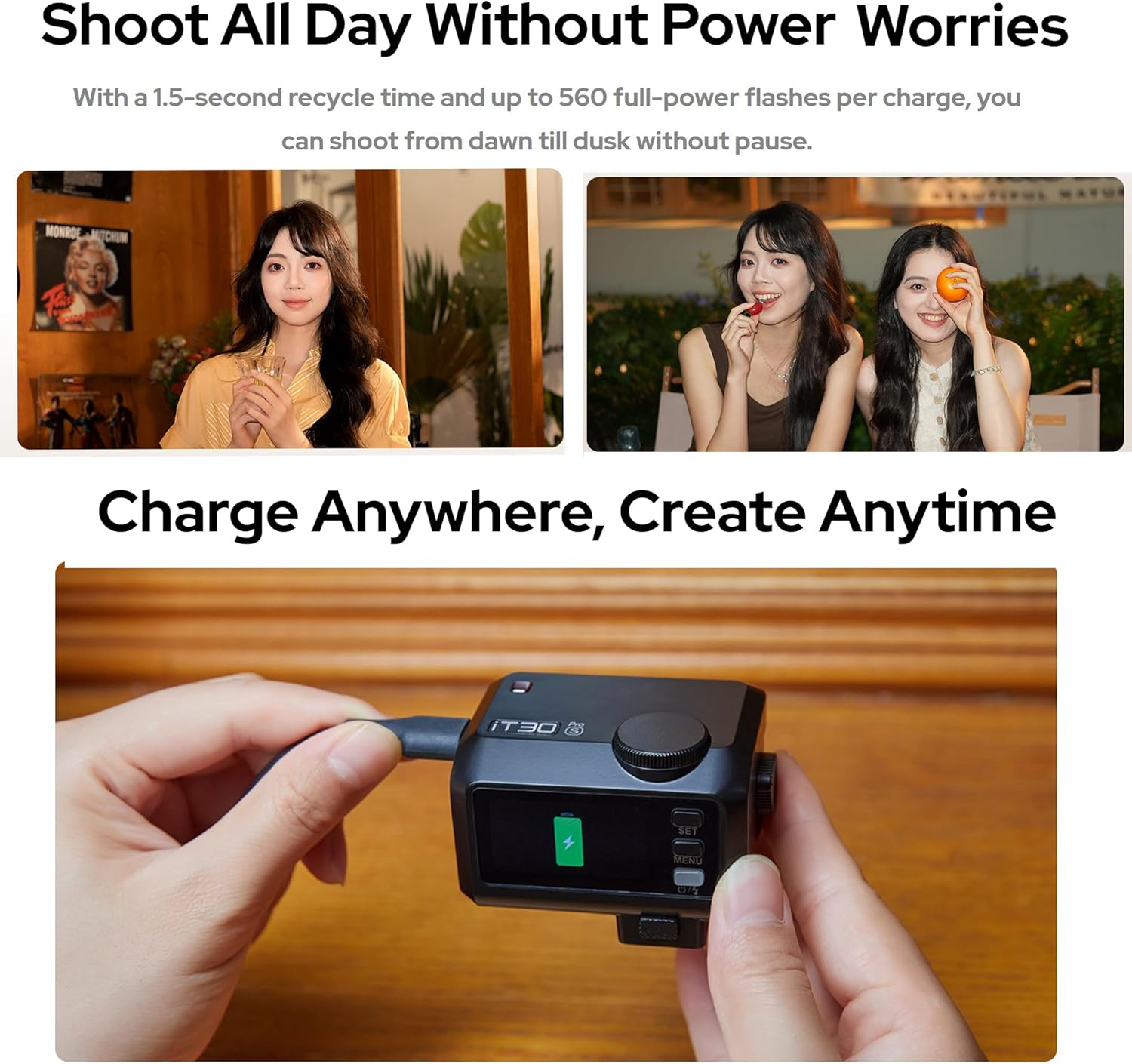- 【Shoot All Day Without Power Worries】With a 1.5-second recycle time and up to 560 full-power flashes per charge, you can shoot from dawn till dusk without pause.The lithium battery supports USB-C fast charging, so you can easily top up between shoots—ready for the next shot in no time.