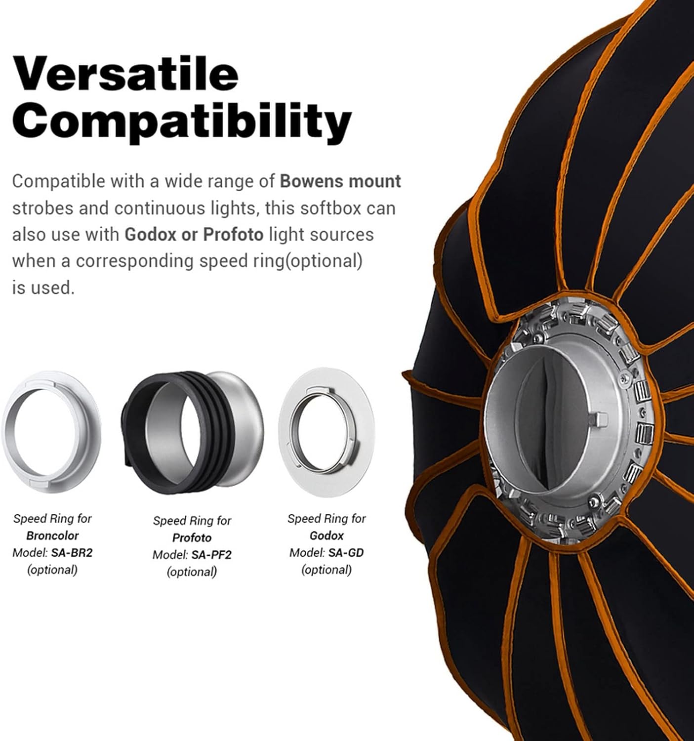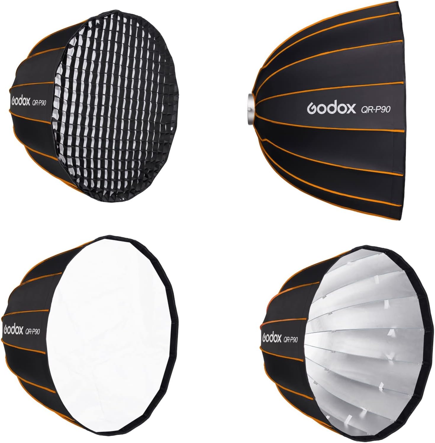 Bowens Mount Softbox: The Godox QR-P90 compatible with a wide range of Bowens mount strobes and continuous lights, this softbox can also use with Godox or Profoto light sources when a corresponding speed ring(Optional) is used
