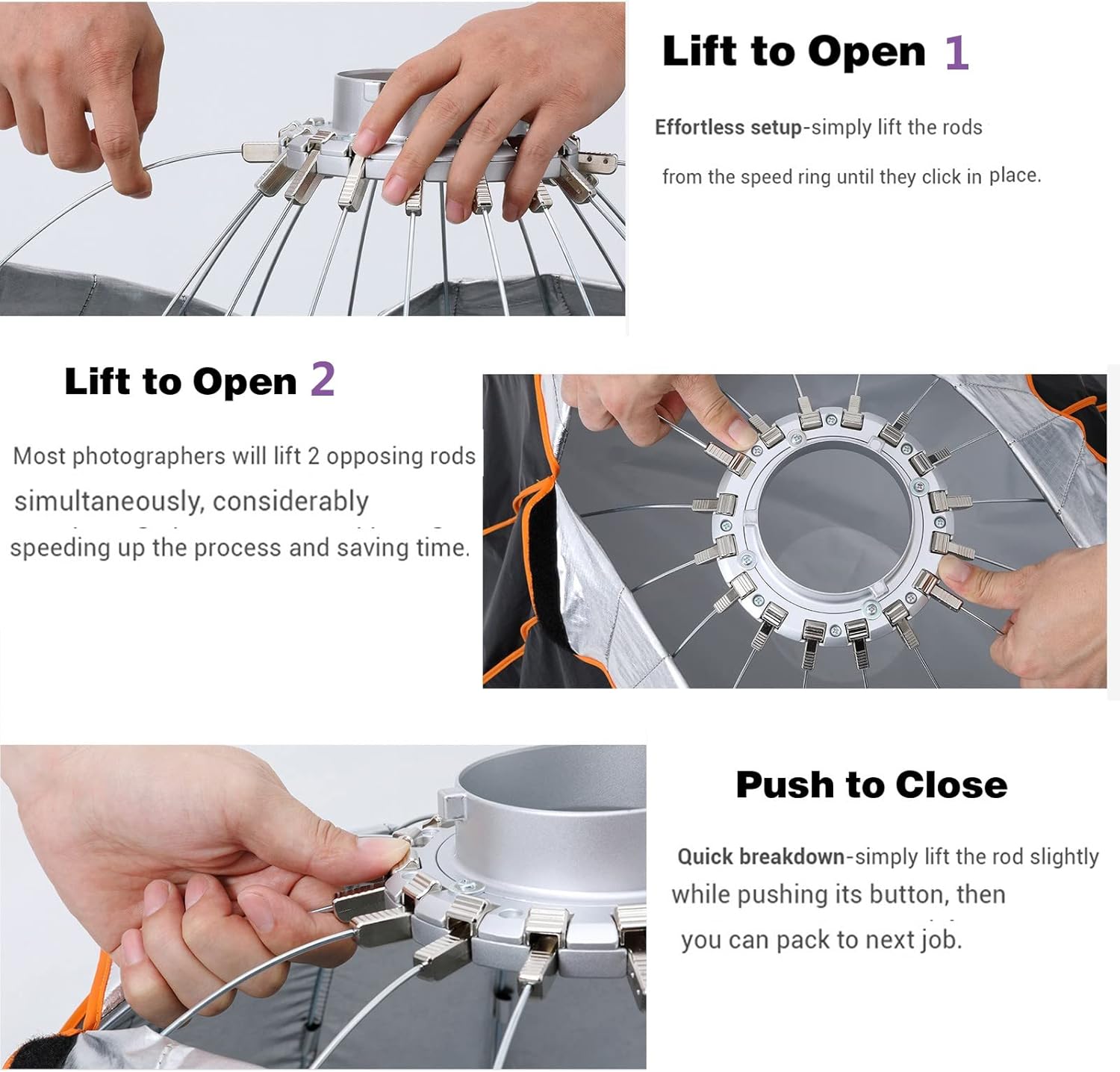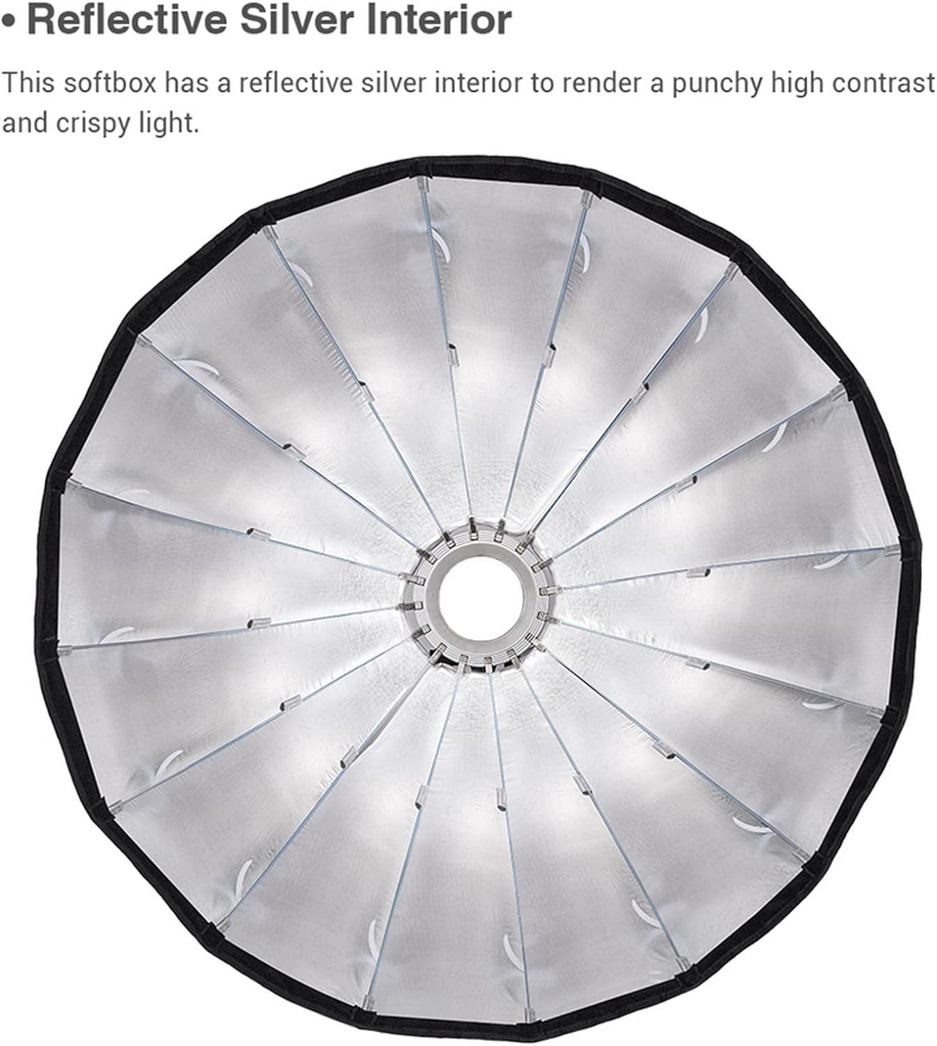 Reflective Silver Interior: This softbox features a reflective silver interior that renders punchy high contrast and crispy light