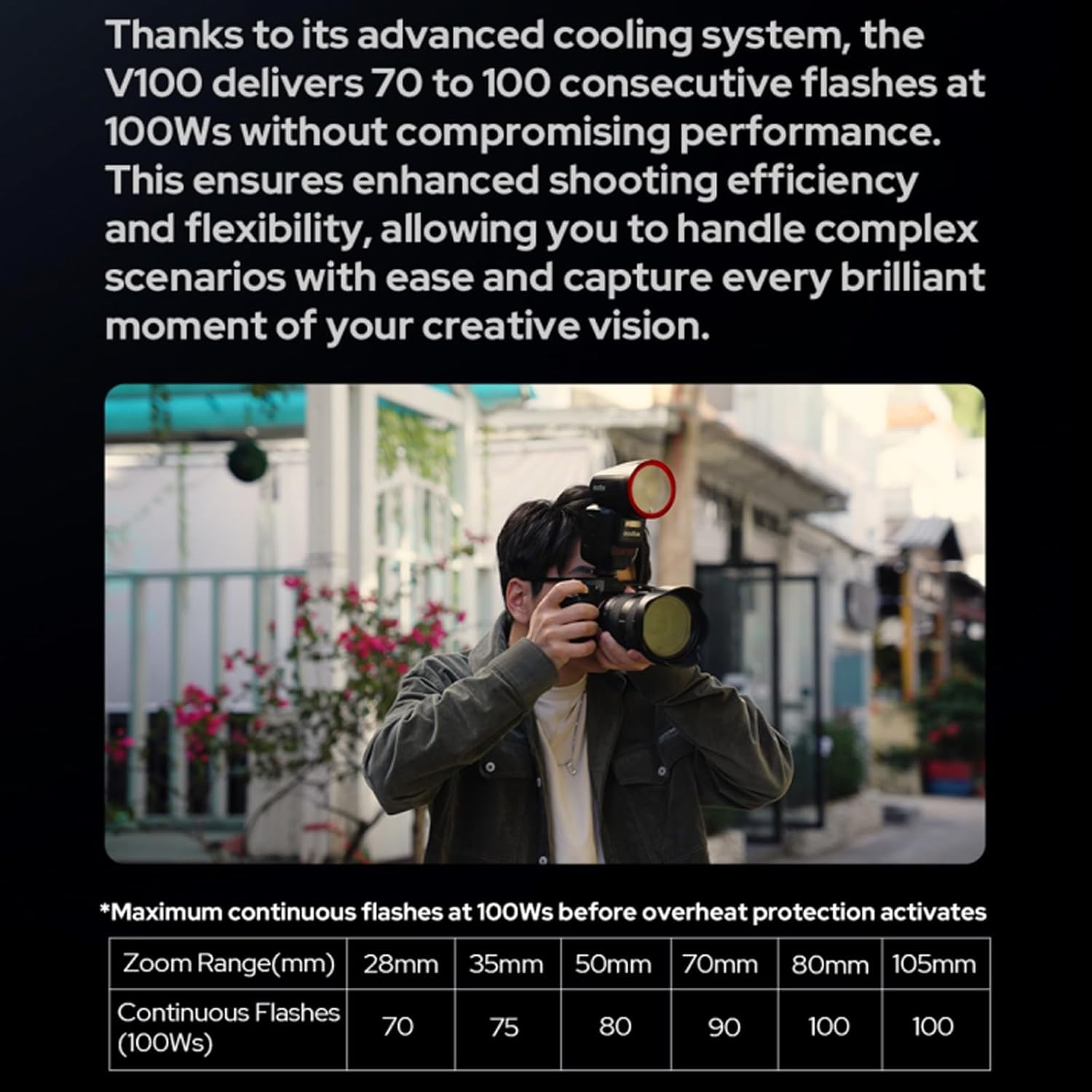 [100Ws, 70 Full-Power] The V100 sets a new benchmark for on-camera flashes by offering an unprecedented 100Ws power at its maximum output(M mode). With adjustable power steps from 1/1 to 1/256 or from 2.0 to 10. Thanks to its advanced cooling system, the V100 delivers 70 to 100 consecutive flashes at 100Ws without compromising performance.
