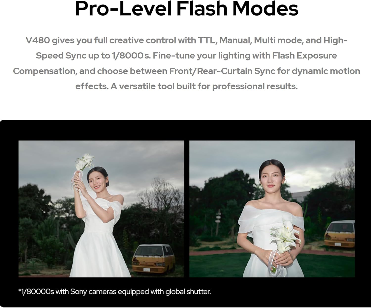 【Pro-Level Flash Modes】Godox V480 gives you full creative control with TTL, Manual, Multi mode, and High-Speed Sync up to 1/8000 s. Fine-tune your lighting with Flash Exposure Compensation, and choose between Front/Rear-Curtain Sync for dynamic motion effects. A versatile tool built for professional results.