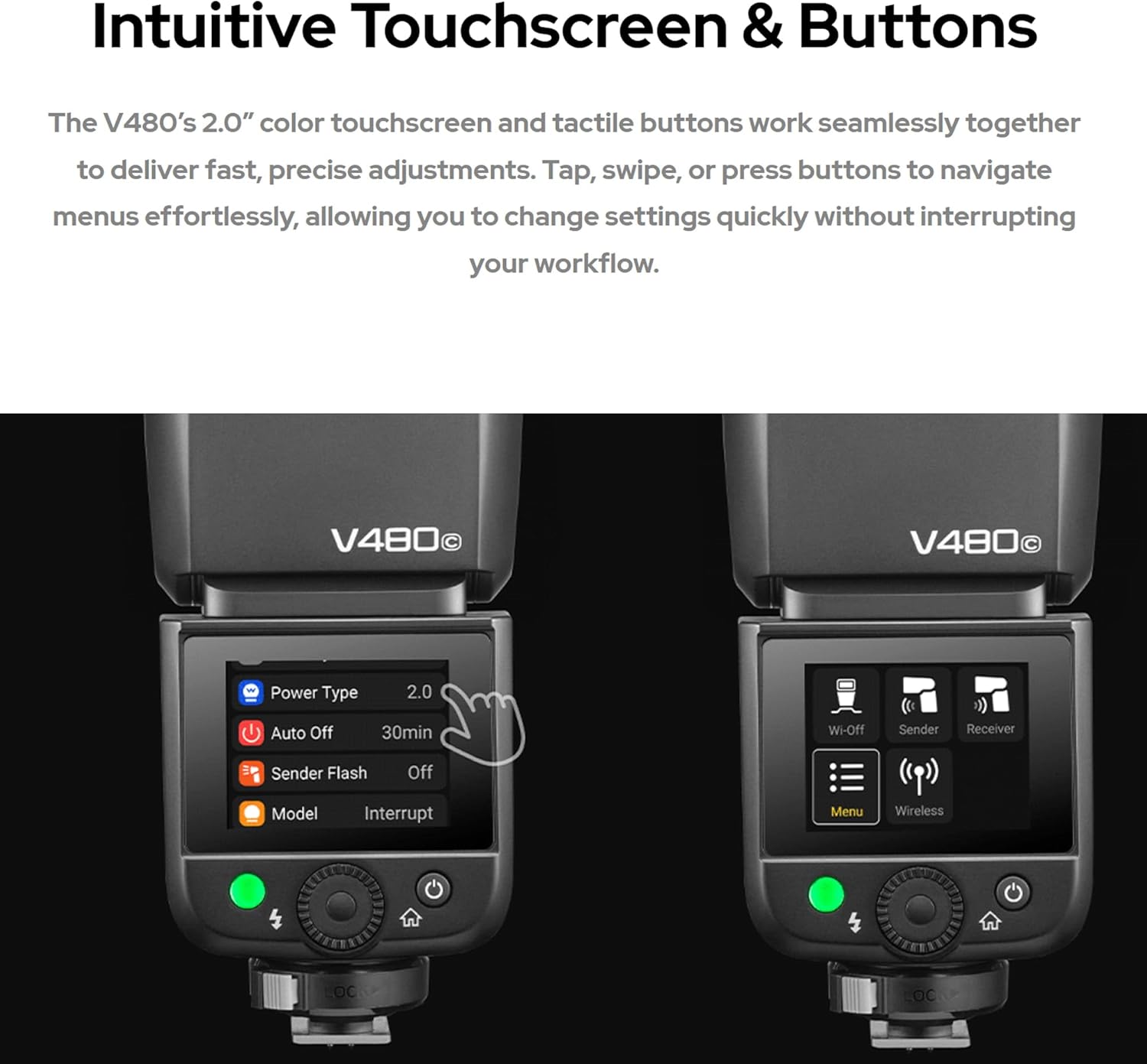 【Intuitive Touchscreen & Buttons】The Godox V480 2.0″ color touchscreen and tactile buttons work seamlessly together to deliver fast, precise adjustments. Tap, swipe, or press buttons to navigate menus effortlessly, allowing you to change settings quickly without interrupting your workflow.Weighing just 282g (361g with battery), the V480 fits comfortably in your hand and slips into any camera bag.