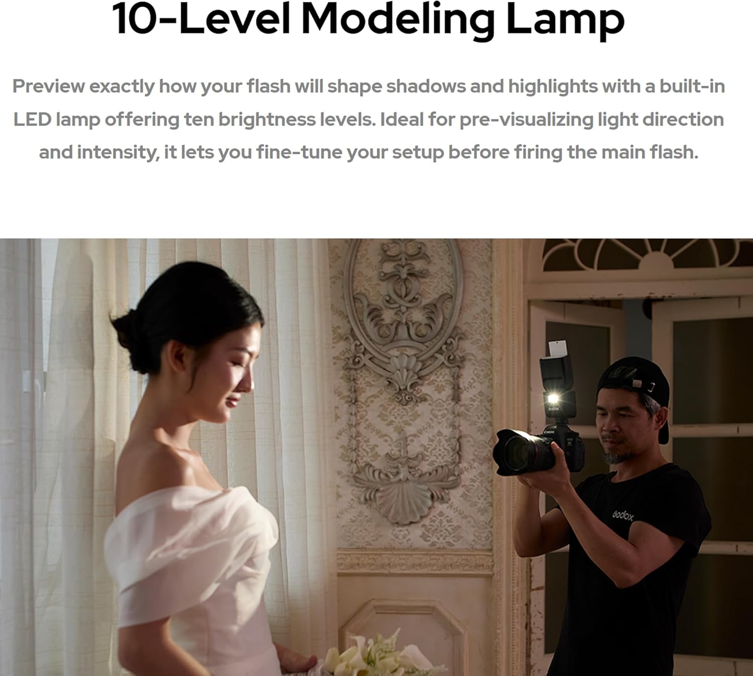 【 10-Level Modeling Lamp】Preview exactly how your flash will shape shadows and highlights with a built-in LED lamp offering ten brightness levels. Ideal for pre-visualizing light direction and intensity, it lets you fine-tune your setup before firing the main flash.