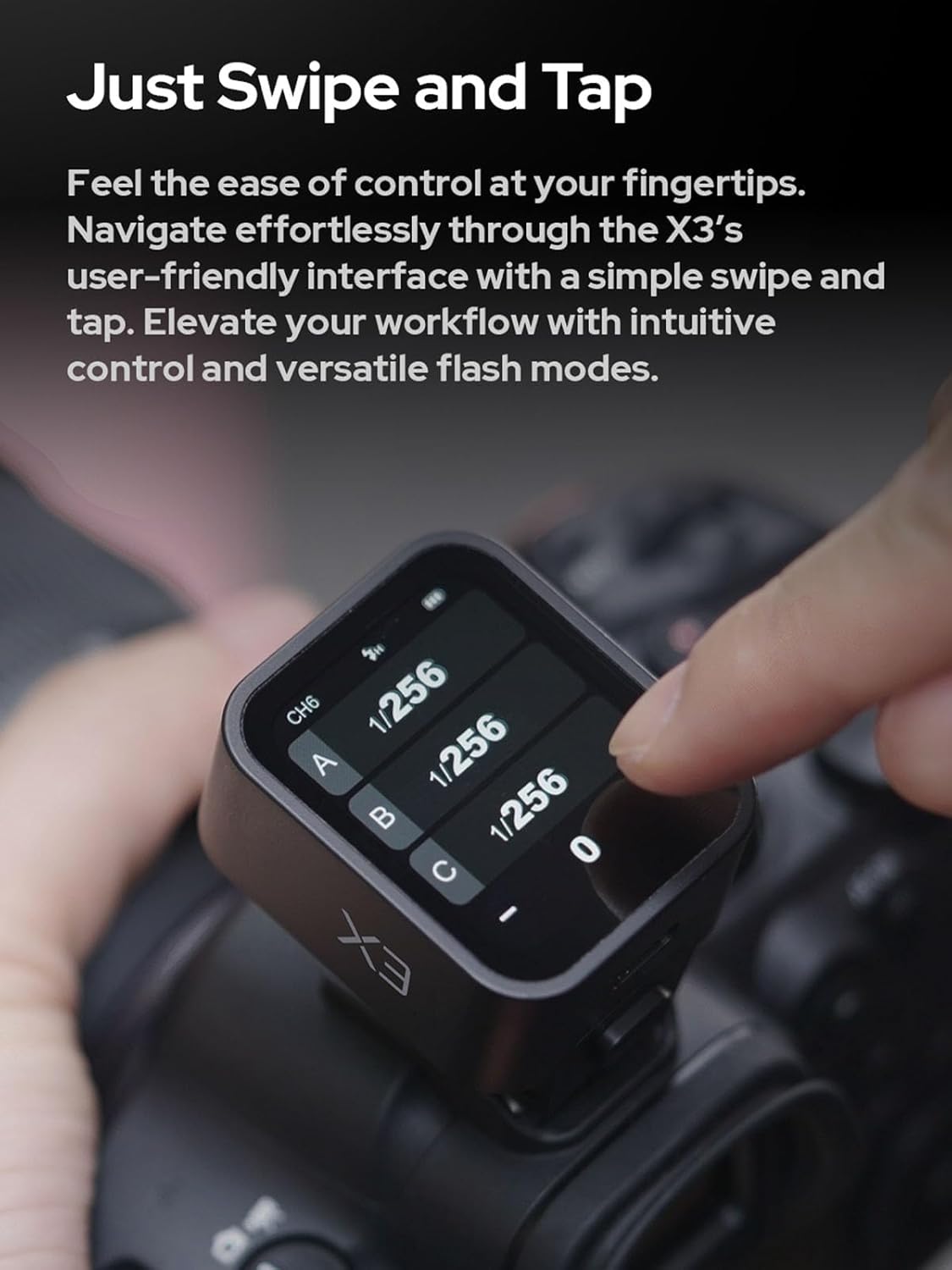 Just Swipe and Tap: Navigate with unparalleled ease using the X3 S's intuitive interface. A simple swipe and tap grant you access to a world of features, including TTL, multiflash mode, HSS, front curtain sync, and rear curtain sync.