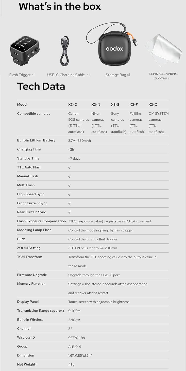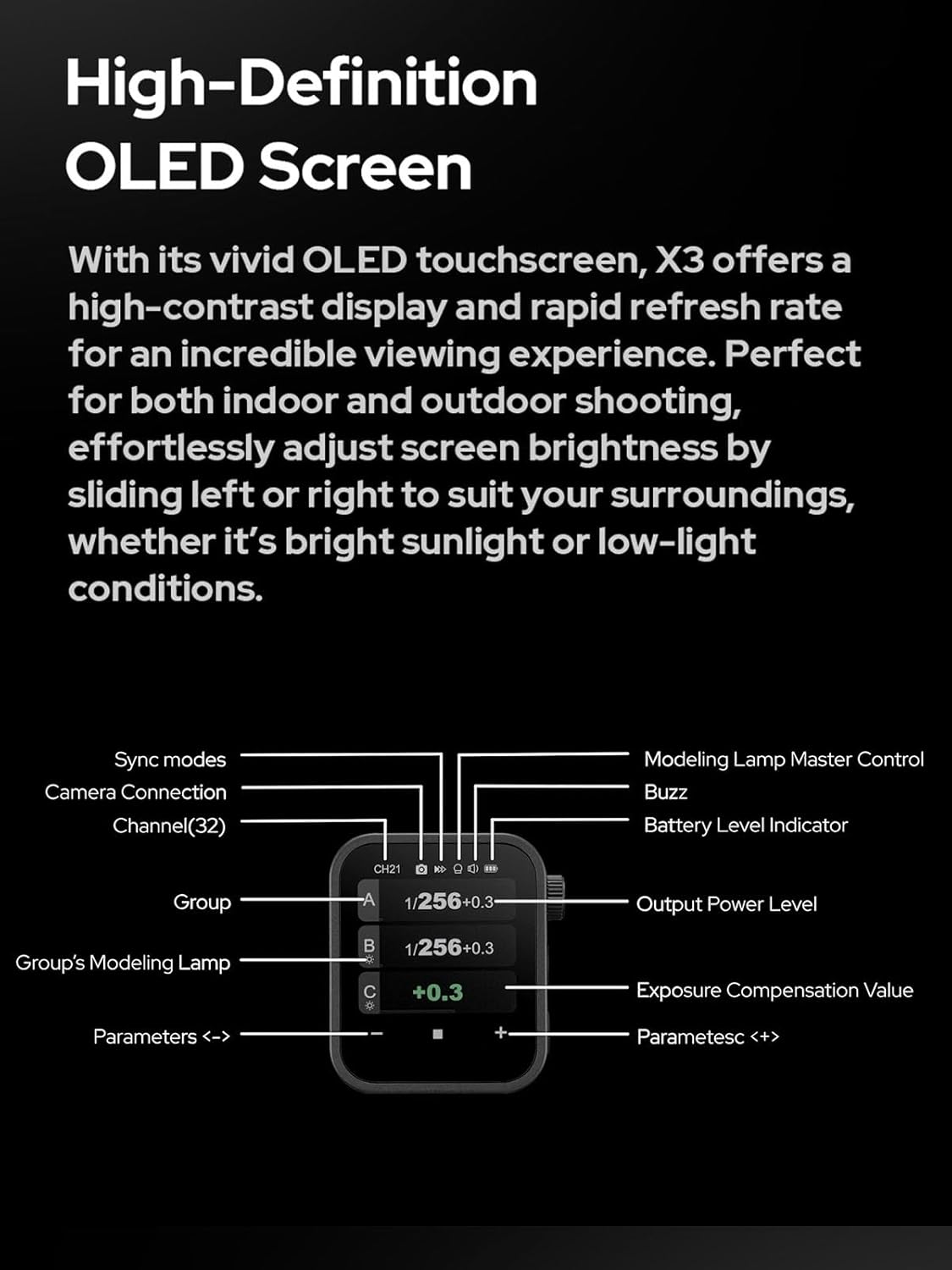 High-Definition OLED Screen: Experience unparalleled clarity with the Godox trigger X3 S's state-of-the-art OLED touchscreen. Engineered for an immersive viewing experience, its high-contrast display ensures vibrant visuals and swift refresh rates.