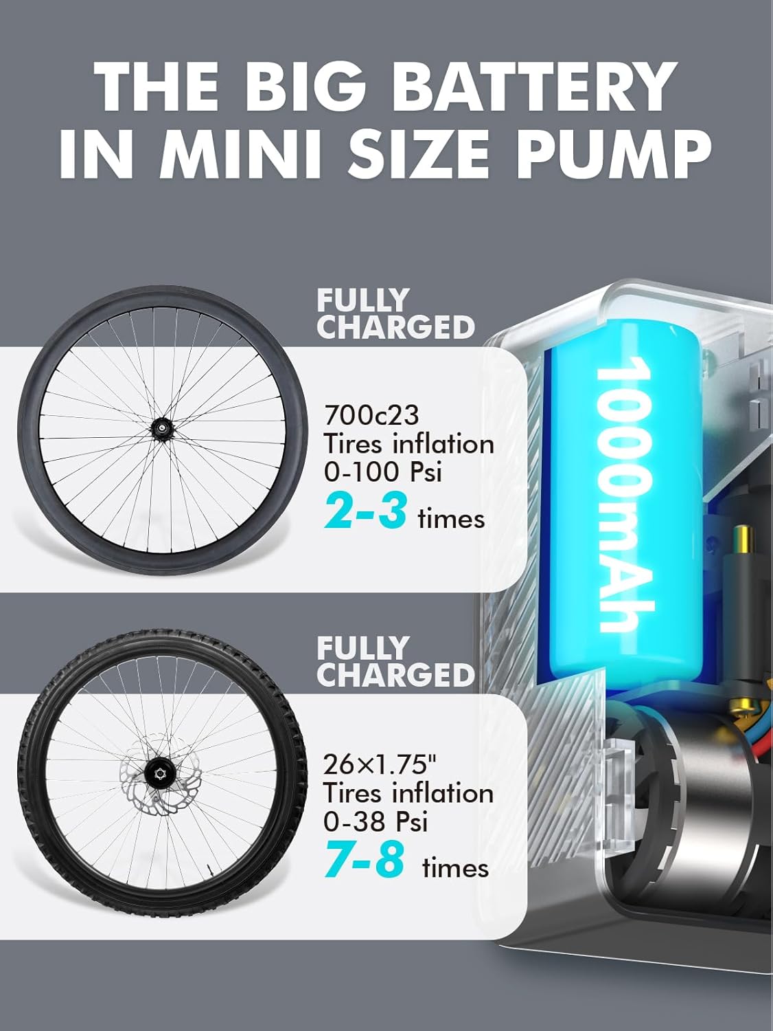 - Compact Size, Powerful Battery: The GPUTEK micro bicycle pump is equipped with a 1000mAh rechargable battery, which allows you to inflate a 700c23 tire from 0 to 100 PSI 2-3 times, or from 80 to 100 PSI 9times on a single charge. It is an essential cycle accessories can meet your daily riding needs and cope with any emergency situations