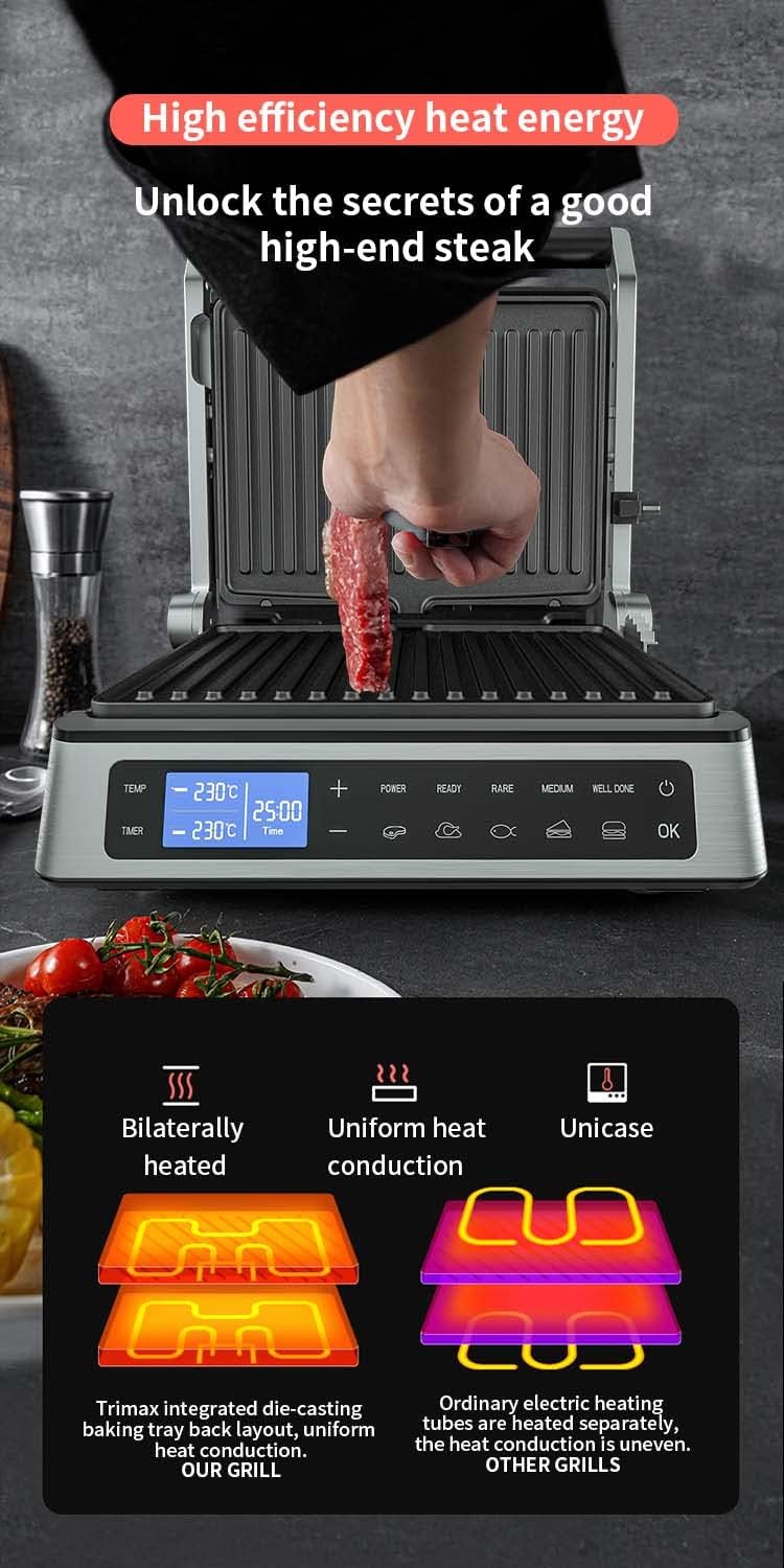 - Level of doneness: Rare, Medium, Well done; Adjustable using timer function